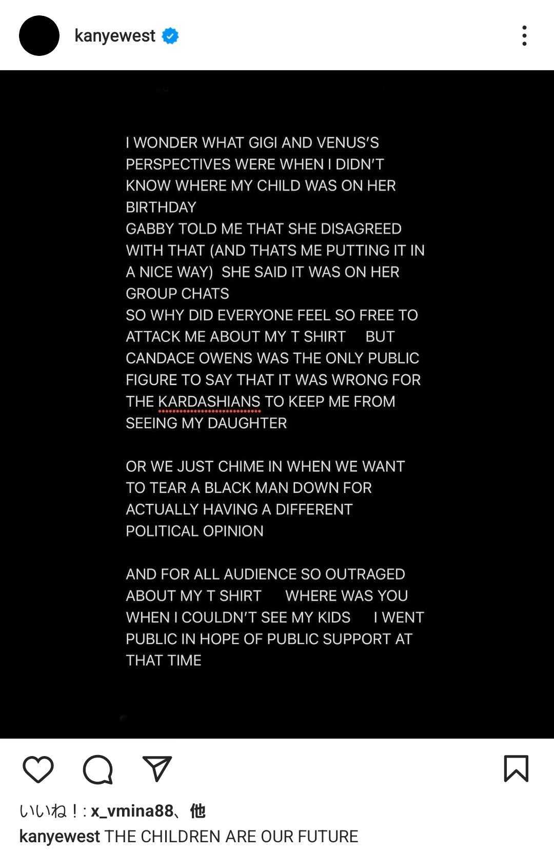 「君たちは嘘つきです。君たちは父親がいなかったという記憶を植えつけるためにシカゴを誕生日に誘拐したのです。あの子の誕生日の会場を教えてくれたのは(キムの妹カイリーのパートナーである)トラヴィス(・スコット)。君たちはそうやって黒人の父親をもてあそぶんだ。君たちはサームの誕生日も事前にパーティーを開いたんだ。俺がサームの誕生日会に出席するために日本から飛行機で帰ってきていたのに、俺がパーティーのことを知ったのはネットで写真を見たときだ。加えるなら、本来なら俺は子どもに100%会えるべきだ。しかし別居しているから、せめて50%であるべきだ。ジーザスの名の元、君たちはドンダ(※カニエの母)を相手にはこんなことしなかっただろうな」