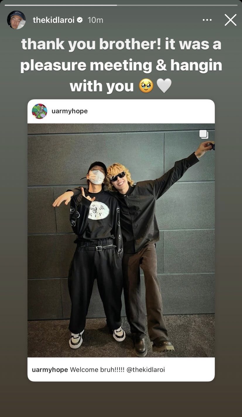 韓国の街中も散策するなど、観光も楽しんだラロイは、BTSが所属するHYBEの事務所を訪問。HYBEの事務所では、BTSのJ-Hopeと対面。2人は表向きに直接会ったことはなかったものの、8月に開催されたロラパルーザでザ・キッド・ラロイの後にJ-Hopeがパフォーマンスしたことがあった。