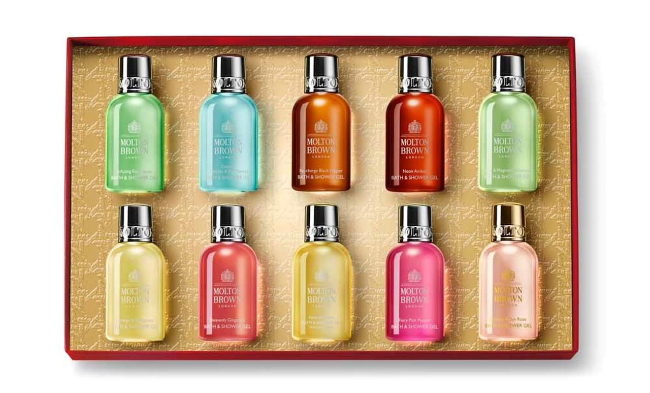 「ストッキングフィラーコレクション」は、ブランドのアイコニックフレグランスのバス&シャワージェル10種をコレクションしたギフトセット。美しいギフトボックスを開けると、ジュエリーのように煌びやかな輝きを放つ色彩豊かなバス&シャワージェルが登場。誰からも喜ばれる「モルトンブラウン」を代表する人気のギフトセットとなっている。