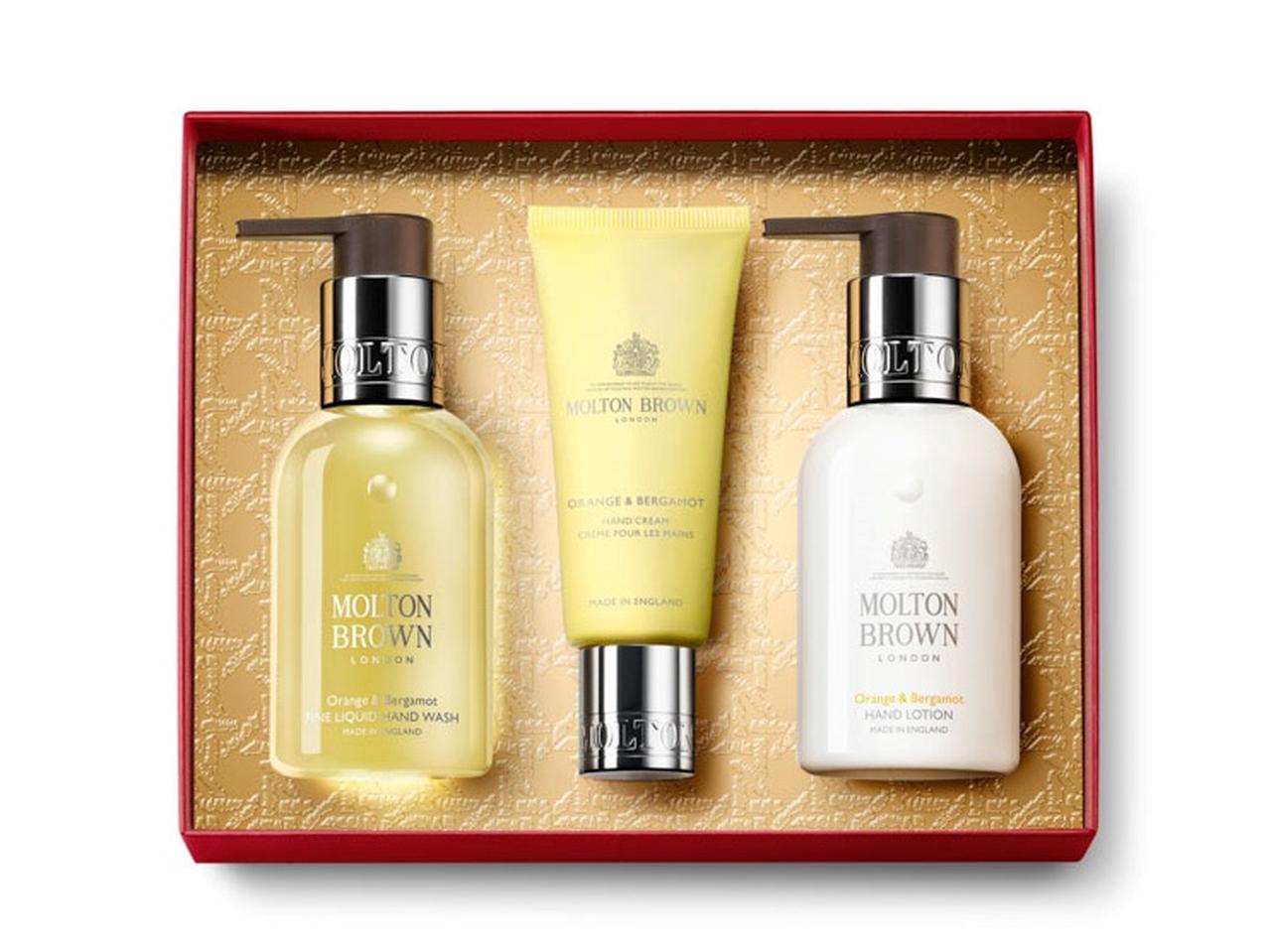 「オレンジ&ベルガモット コレクション」のハンドウォッシュ、ハンドローション、ハンドクリームが入ったギフトセット。セビリアのオレンジオイル、マンダリン、ネロリをブレンドした、上品なシトラス・ホワイトフローラルの香り。