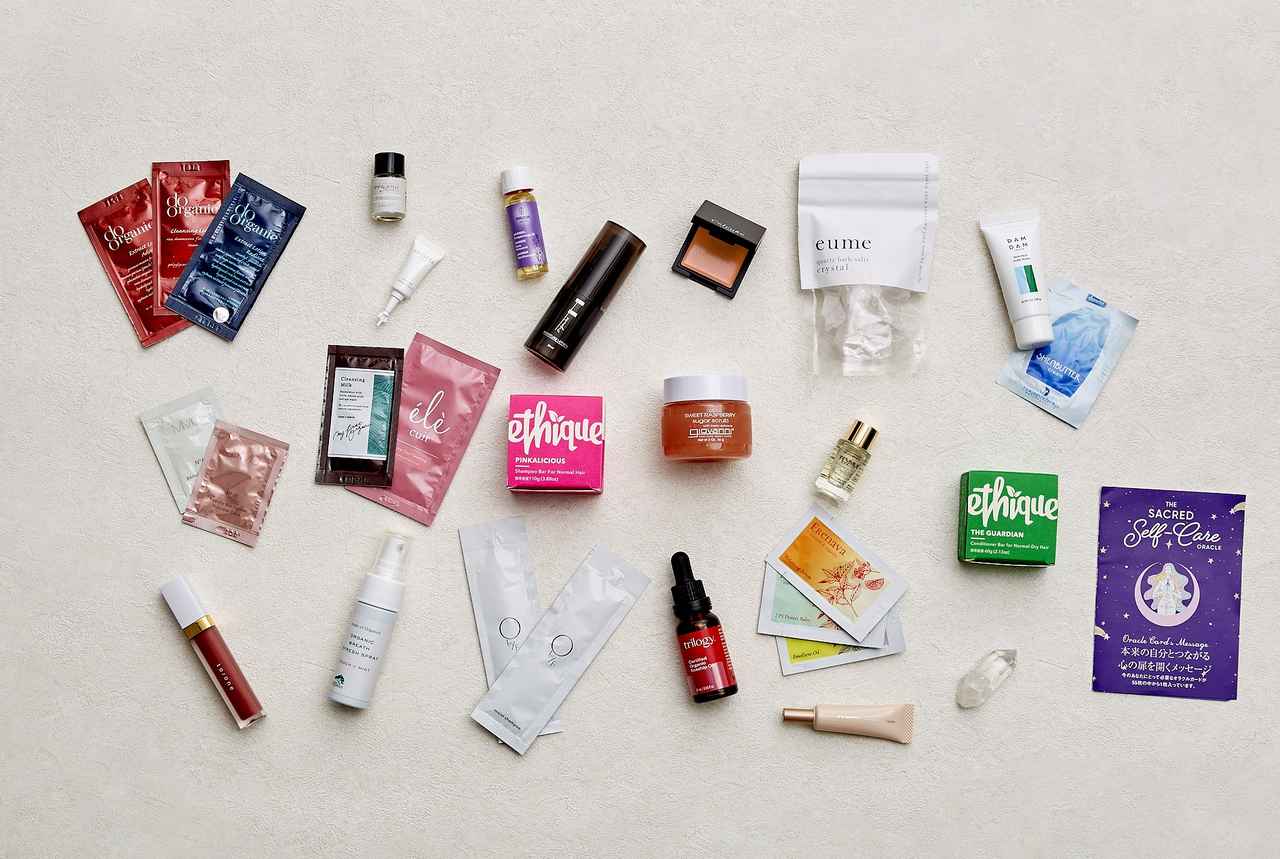 to/one「ペタル エッセンス グロス」やCelvoke「ブロウイング フェイスカラー(限定色)」などのメイクアイテム、さらにはプラスチックフリーでサステナブルなethiqueのシャンプーバー、コンディショナーバーは現品サイズをアソート。
