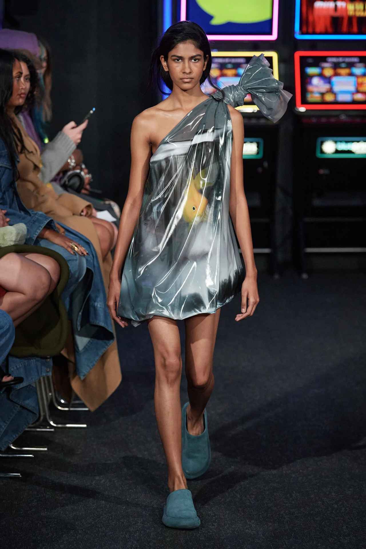 まるで金魚すくいが終わり、金魚が入った袋をそのまま服として着用しているかのようなこのドレスは、先日ロンドン・ファッション・ウィークでJWアンダーソン(JW Anderson)が2023年春夏コレクションとして発表したもの