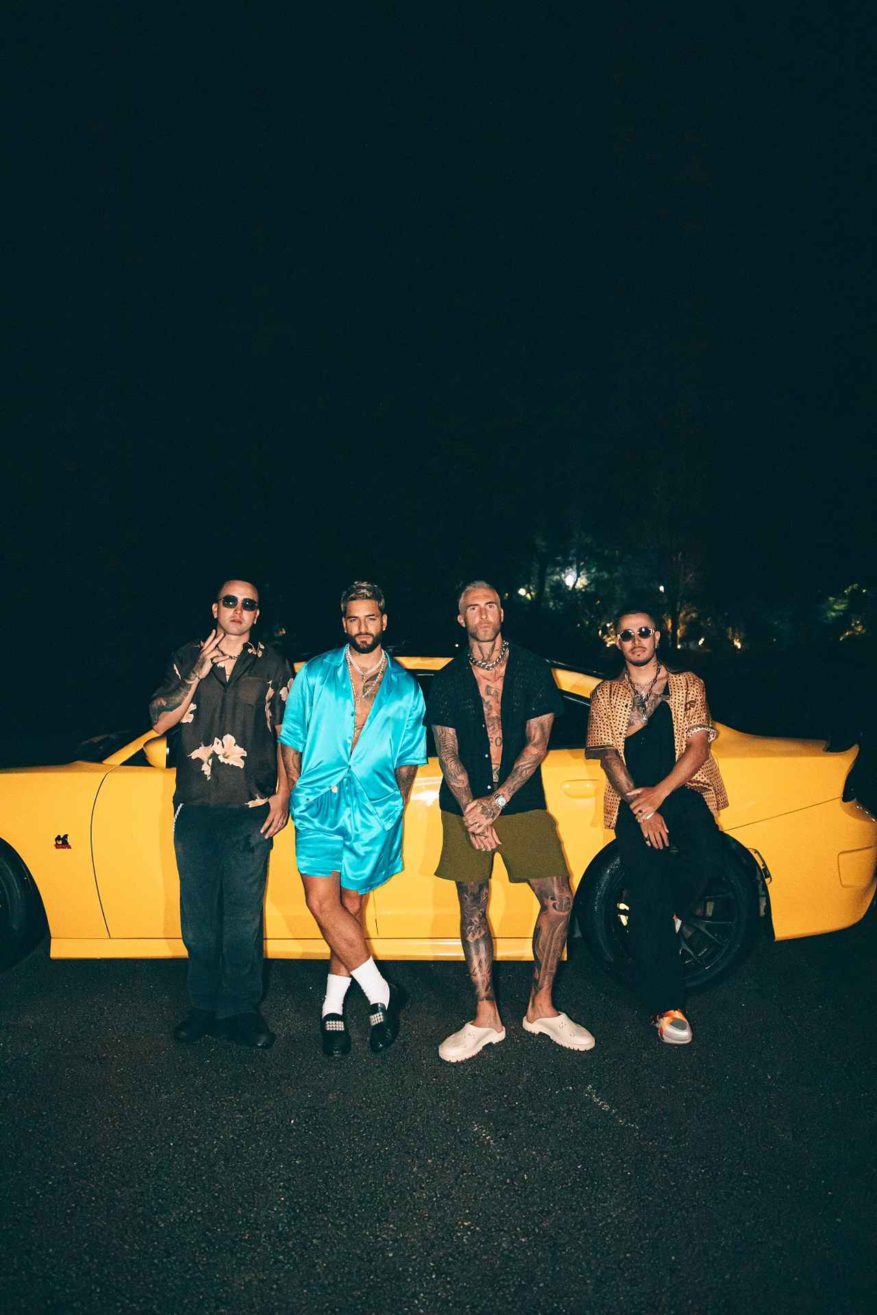 最新シングル「Ojalá(オハラ)」でコラボしたザ・ルードボーイズの2人に挟まれる形で写真に収まる、マルーマ(中央左)と、アダム・レヴィーン(中央右)。