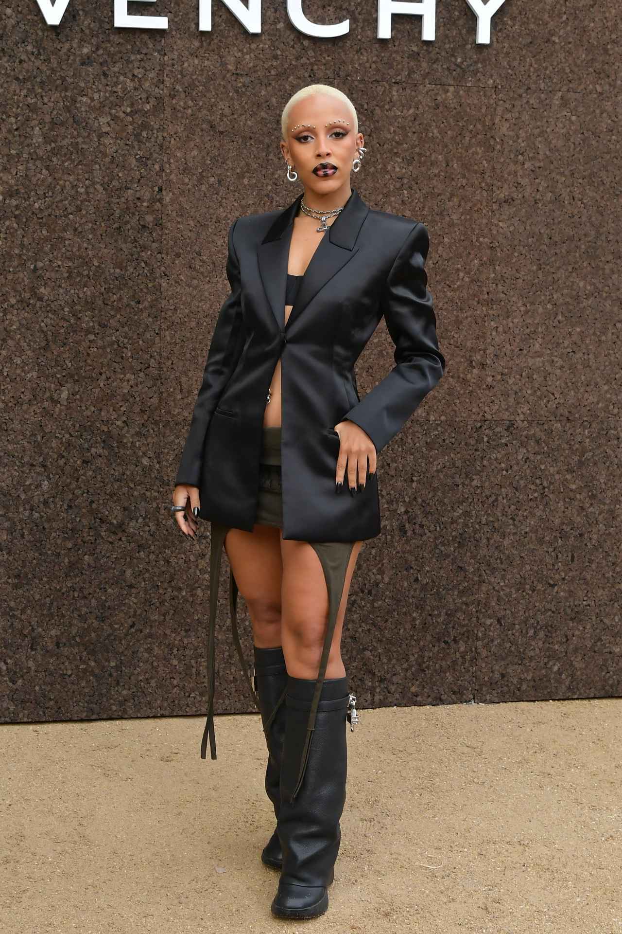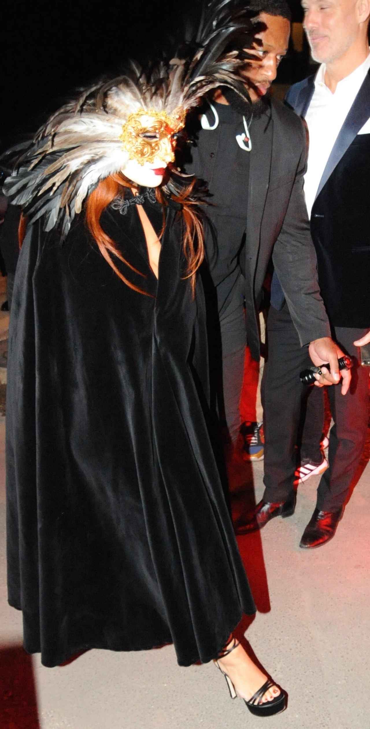 外にいるパパラッチには衣装を見せず、徹底的に防御していたが、会場内でマントを脱ぐとゴージャスなドレスを身にまとい、そのドレスすら脱いでしまうというシーンも見られた。(フロントロウ編集部)