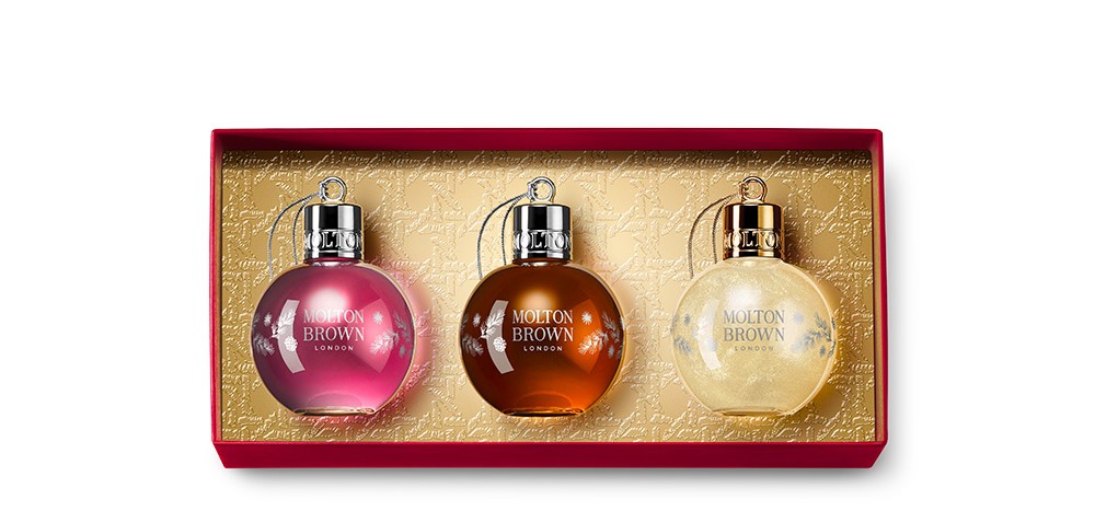 「フェスティブボーブルコレクション」は、モルトンブラウンが2022年のホリデイコレクションとして11月11日(金)に発売するバス&シャワージェルのセット。クリスマスツリーのオーナメントであるボーブル型のボトルに入ったバス&シャワージェル3種がセットされている。