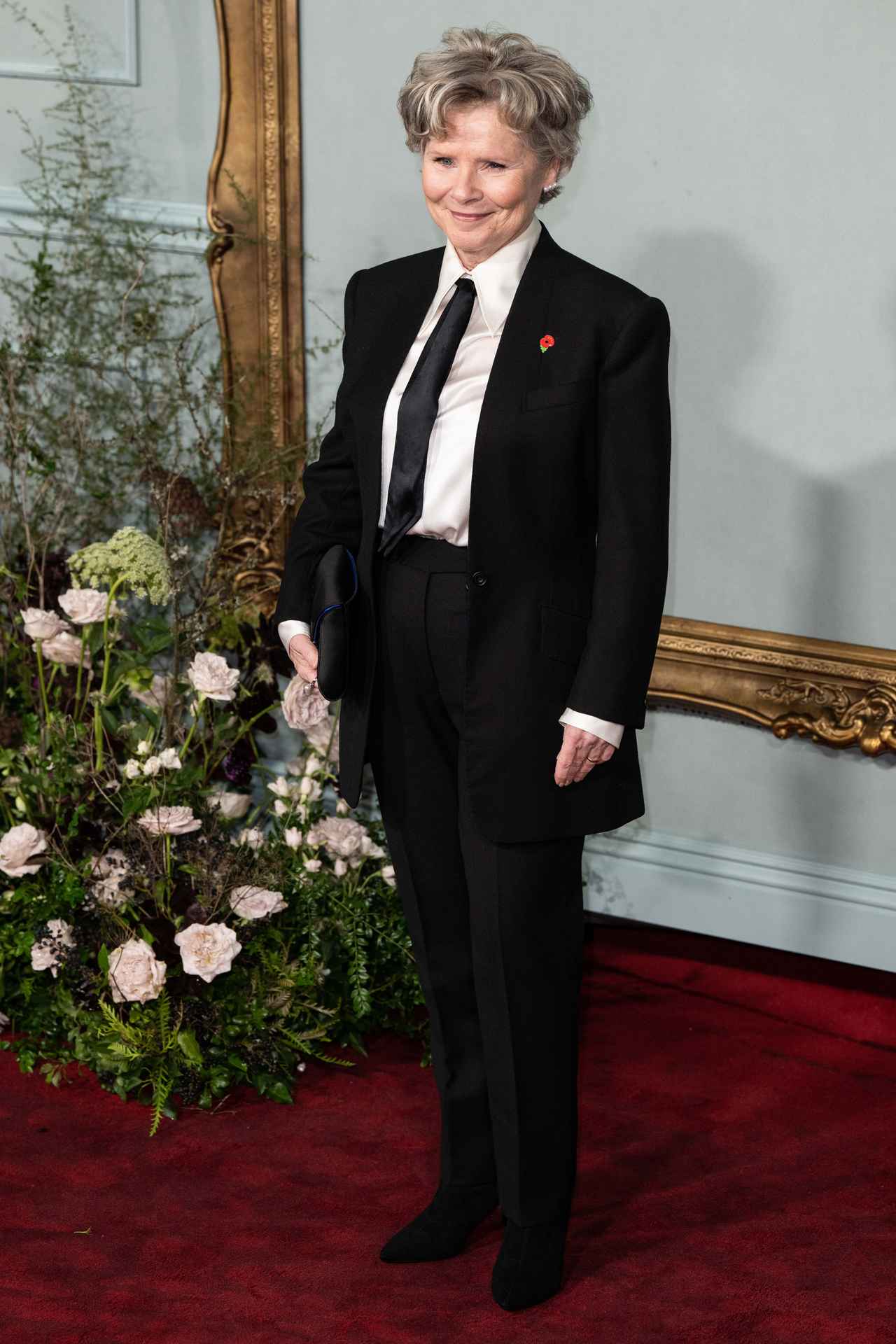 『ハリー・ポッター』でイメルダが演じたドローレスはピンク色の衣装が印象的だったが、『ザ・クラウン』のプレミアでは黒のスーツに黒のネクタイを合わせたスタイルで登場。ハイウエストのパンツと、フォルムの美しいジャケットにクラッチバッグを合わせたスタイリッシュな装い。