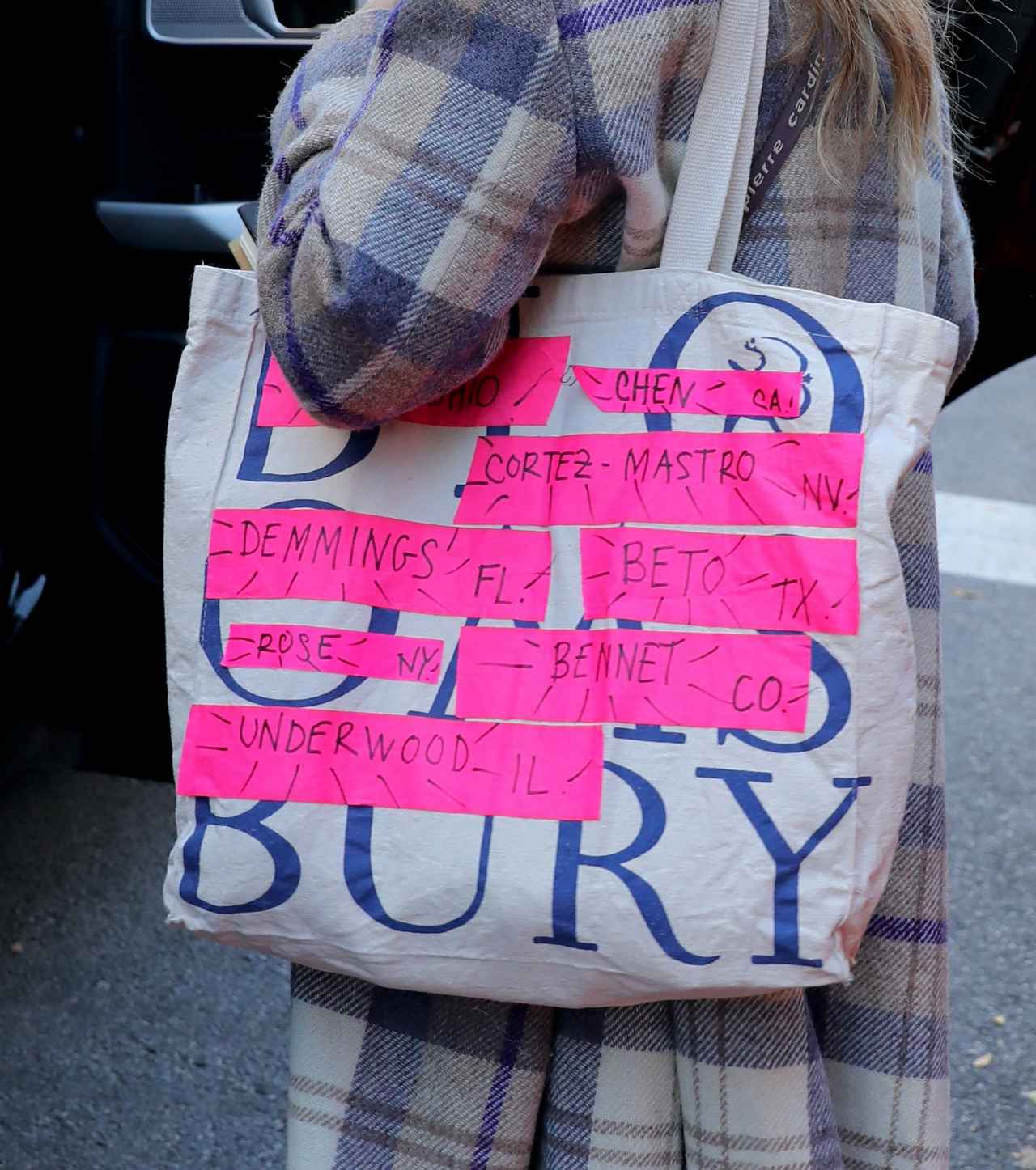 そして意気揚々と歩き出したサラのバッグに貼られていたのは、無数のガムテープ。パパラッチに“もっと写真を撮って”と言わんばかりにサラがアピールしたそのバッグにズームしてみると、ガムテープにはアメリカ各州の民主党議員の名前が書かれていた! アメリカでは11月8日に中間選挙の投開票が行なわれたのだが、この日はその1週間弱前。サラはドラマの撮影に対する注目度を利用して、自身が支持する候補者を宣伝する機会としたのだ。