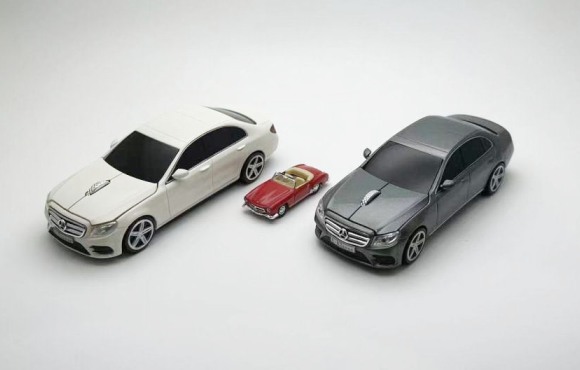 無線マウスのモデルとなったメルセデス・ベンツ Eクラスは、同社の中核モデル。モデル名を表す「E」は、1950年の燃料噴射技術から“Einspritzung”(ドイツ語で燃料噴射)の頭文字であり、メルセデス・ベンツの主力モデルの1つとなっている。