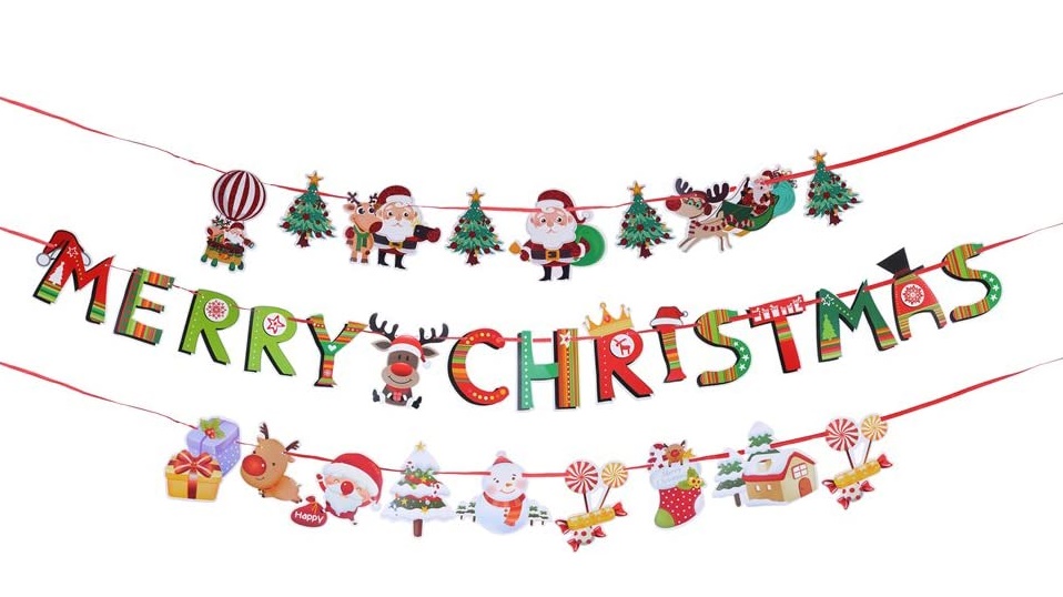 壁に吊るすだけでクリスマスムードを演出できるガーランド。メリークリスマスのメッセージや、サンタクロースのイラストなど、まさしくクリスマスなデザインがカワイイ。繰り返し使えるので、1つゲットしておくと重宝するはず。