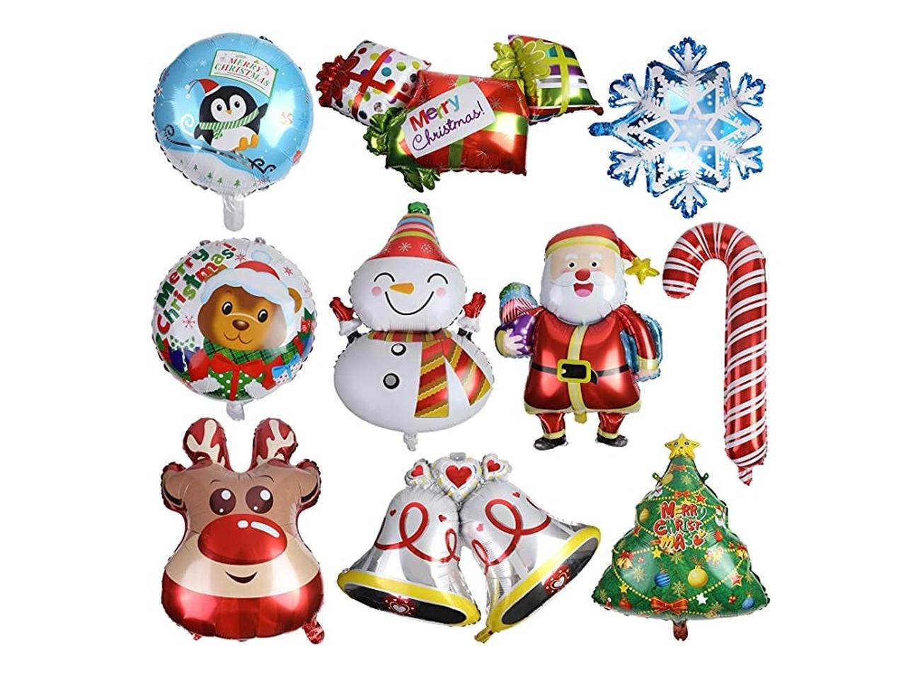 サンタクロースやクリスマスベル、クリスマスツリーなどの形のアルミバルーン10個がセットになった製品。天井から吊るしたり、壁などに貼ったりと用途は様々で、クリスマスパーティの飾りつけにもぴったり。