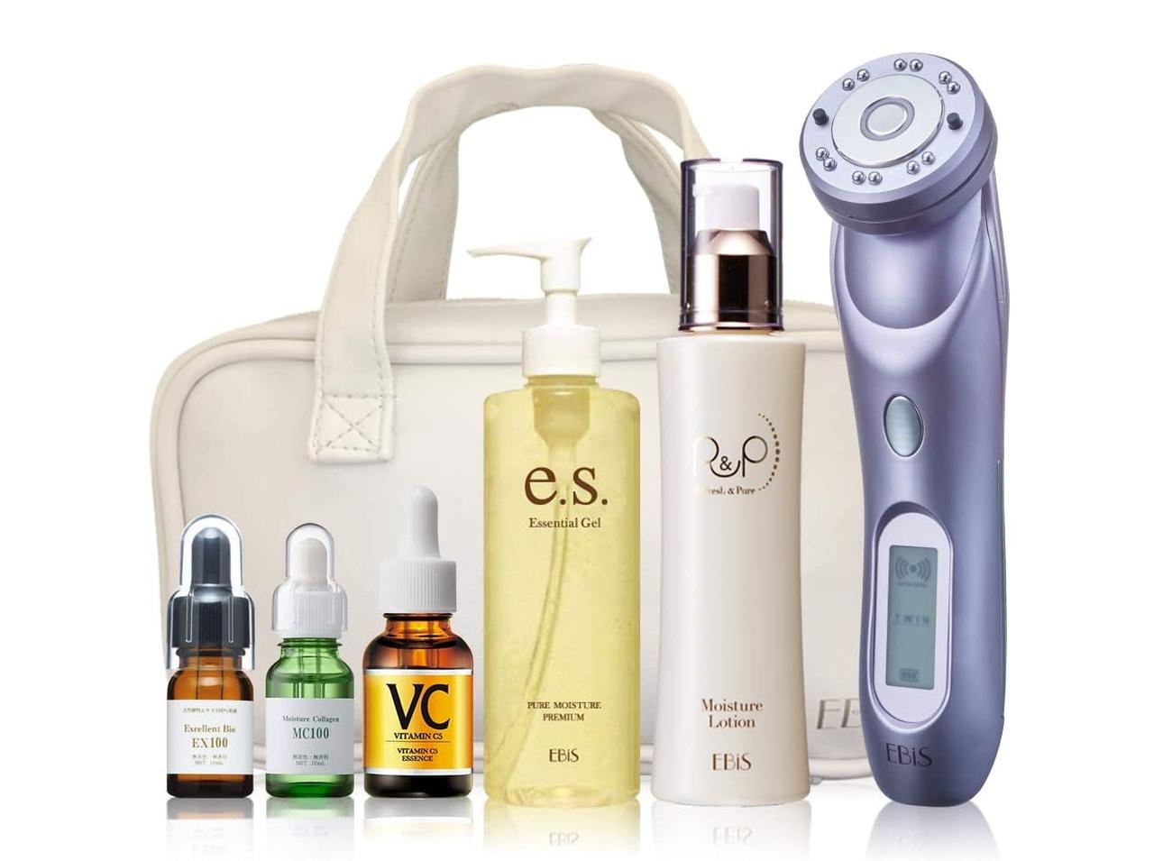 エビス化粧品(EBiS)の「インエレナイザープレミアム ホームエステセット」は、1台6役4つのモードを搭載した美顔器「ツインエレナイザープレミアム」をはじめ、化粧水、ビタミンC美容液、植物性コラーゲン原液、植物性プラセンタ原液、イーエスエッセンシャルジェルなどがセットになった豪華なセット。毎日のケアをぐんとグレードアップできる。