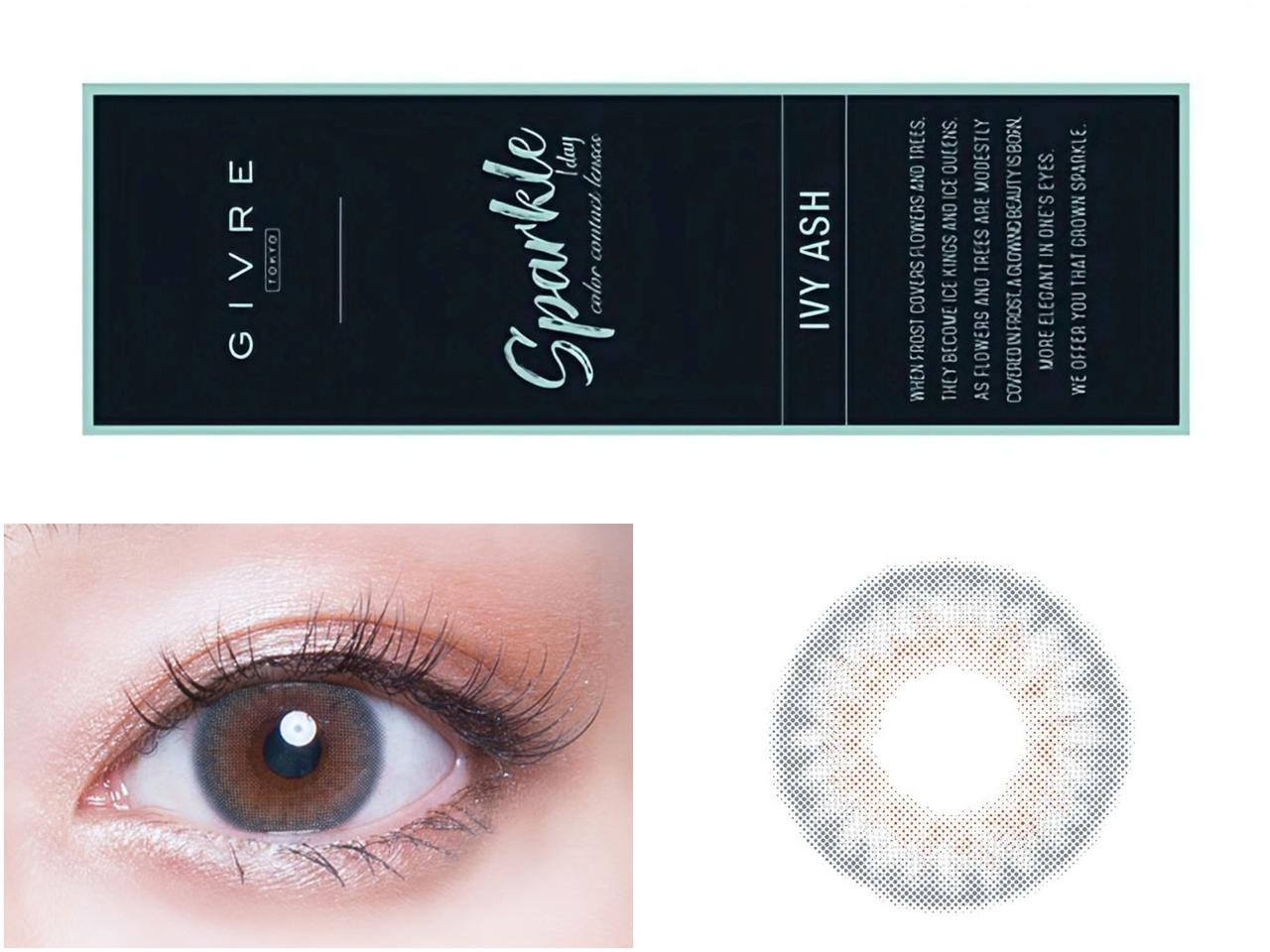 ジーヴル(GIVRE)の「スパークル」は、なりたい自分、今までとは違う自分を表現する絶妙カラーのワンデーカラコン。カラコン初心者からヘビーユーザーまで、瞳からオシャレを楽しみたい、日常に変化が欲しい人のためにピッタリ。人気色の「アイビーアッシュ」は、透明感のあるブルーアッシュでうるんだ瞳を演出する。