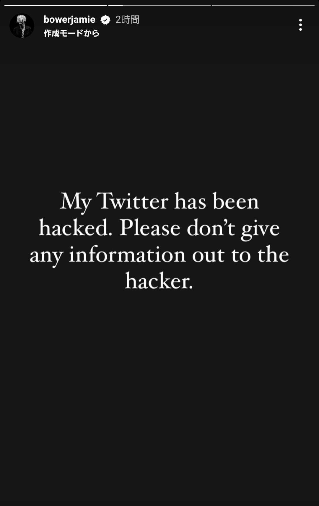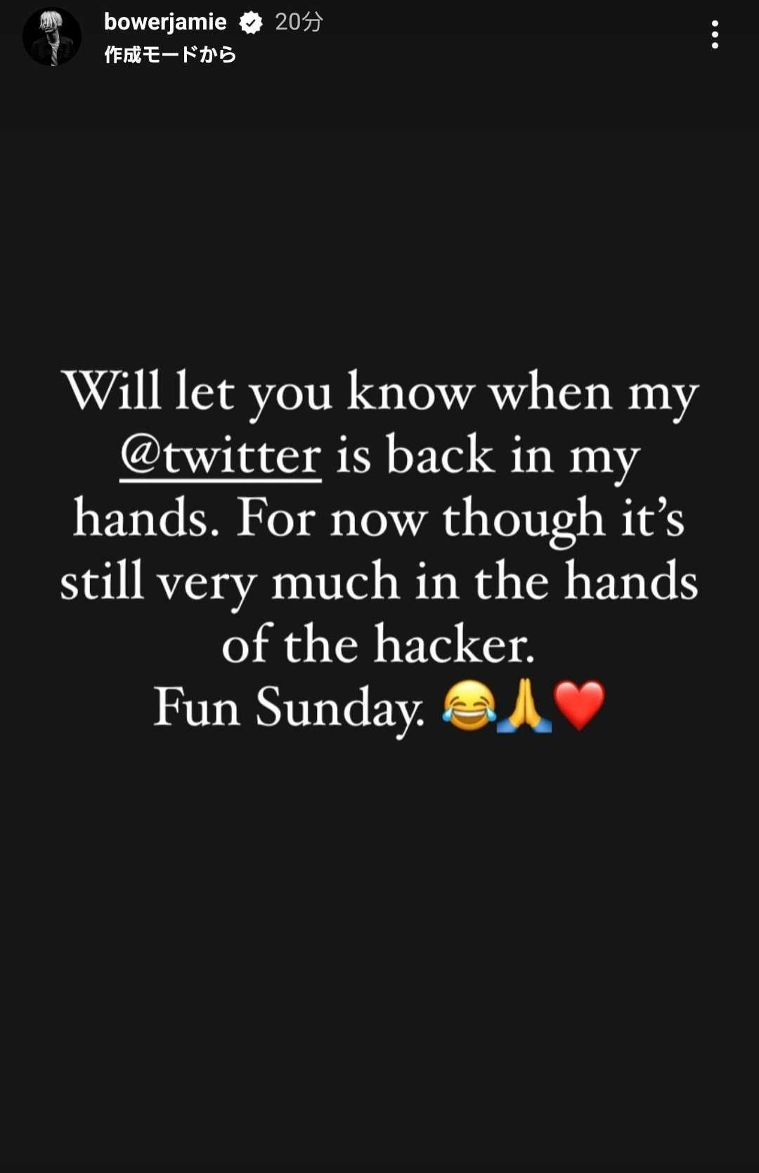 そのことを知ったジェイミーはすぐさま「私のツイッターがハッキングされました。ハッカーに情報を与えないでください。私のツイッターが元に戻ったらお知らせします」とインスタグラムでコメント。残念ながら日曜日の時点でまだ戻ってきていなかったようで「今のところ、まだハッカーの手の中にあるけれどね。なんて楽しい日曜日なんだ」と明かしていた。