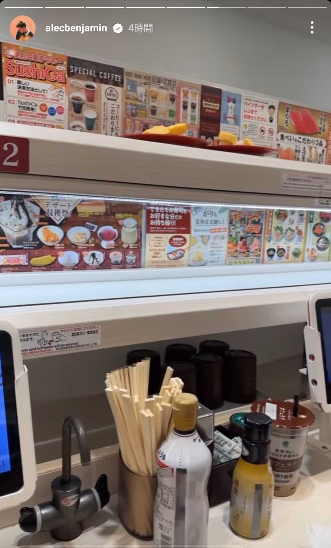 多くの海外アーティストは、回らない寿司屋で本場の寿司を食べるのが来日時のルーティーンとなっているが、アレックが訪れたのは回転寿司。その様子を自身のインスタグラムにアップして日本で回転寿司を楽しんでいた。