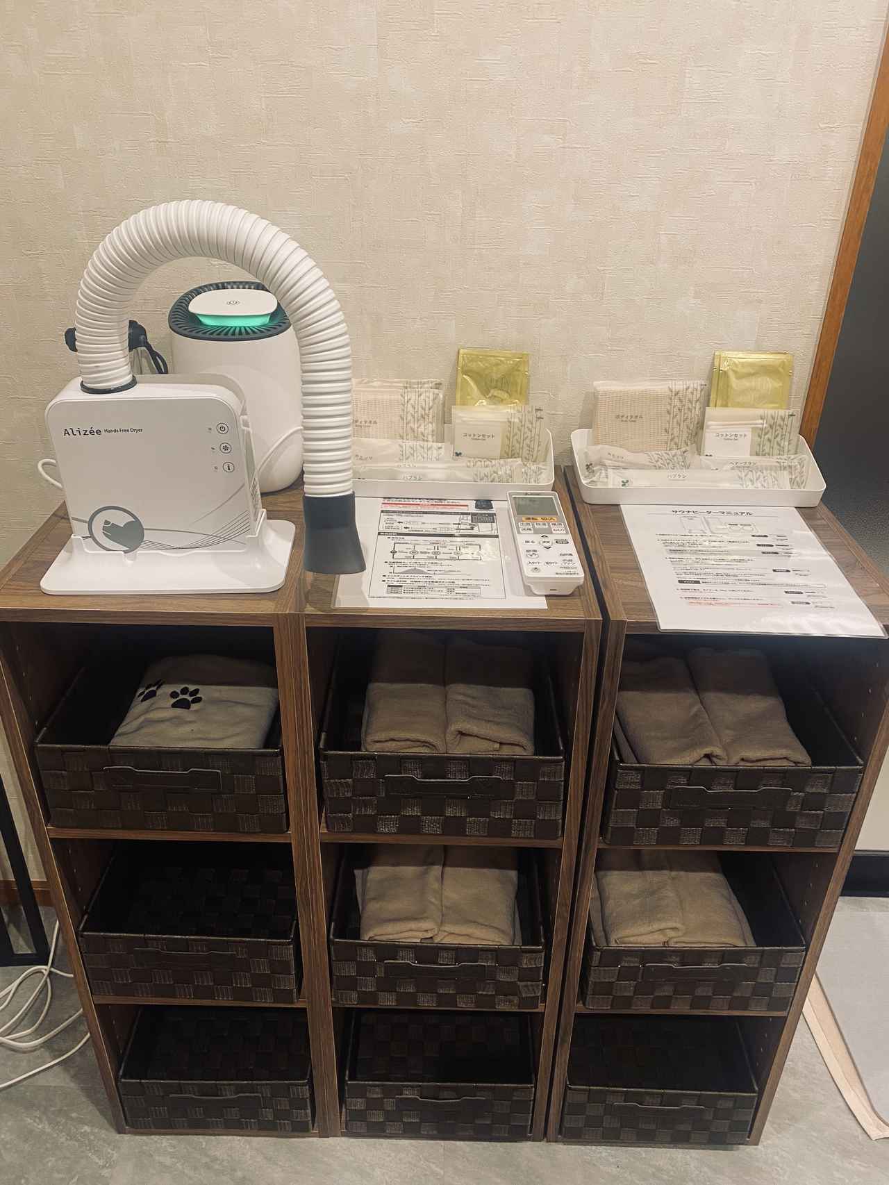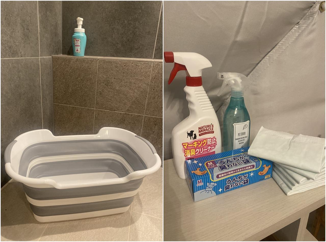 シャワールームには犬用のバスとシャンプー。トイレシーツやマナー袋なども用意されていた。