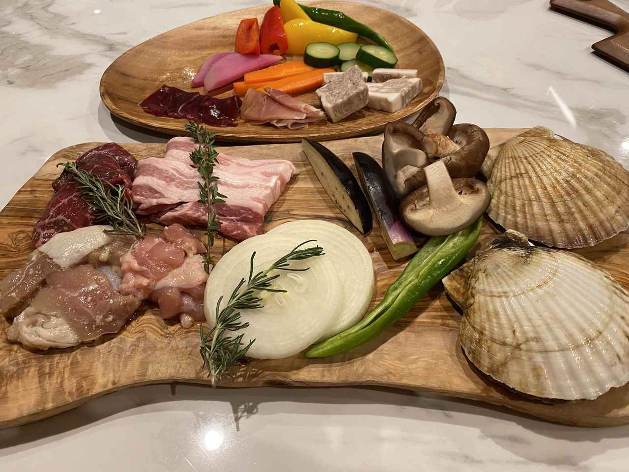夕食のBBQは、ビーフやポークなどの肉類、ホタテやサーモンなどの魚介類のほか、季節の野菜で彩られたバーニャカウダ、ミネストローネ、ボロネーゼなど、イタリアンテイスト。地元山梨の食材で揃えられているという。また、今回は幼児が一緒だったためキッズプレートも用意してくれた。