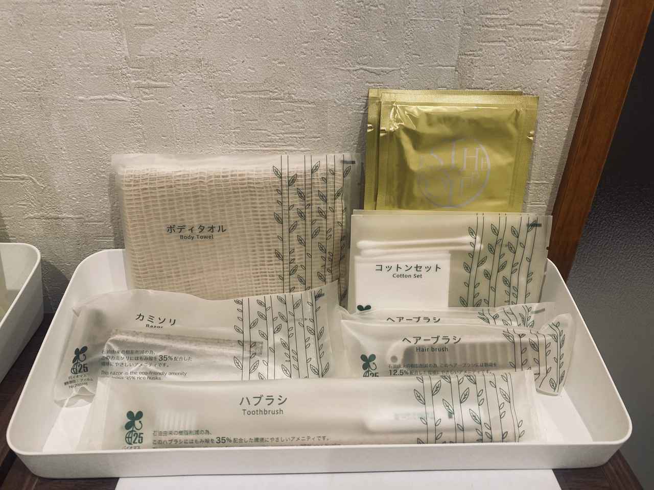 シャワー/露天風呂エリアには歯ブラシやカミソリ、スキンケアグッズいった一般的なホテルにあるアイテムが揃っているが、さすがにないだろうと持参したフェイスマスクがあったのは嬉しいサプライズだった。お風呂場のアメニティは不要になったもみ殻から作られたエコなアイテム。地元食材が使われた食事の地産地消の精神もそうだが、ちょっとしたところにサステナビリティが感じられた。
