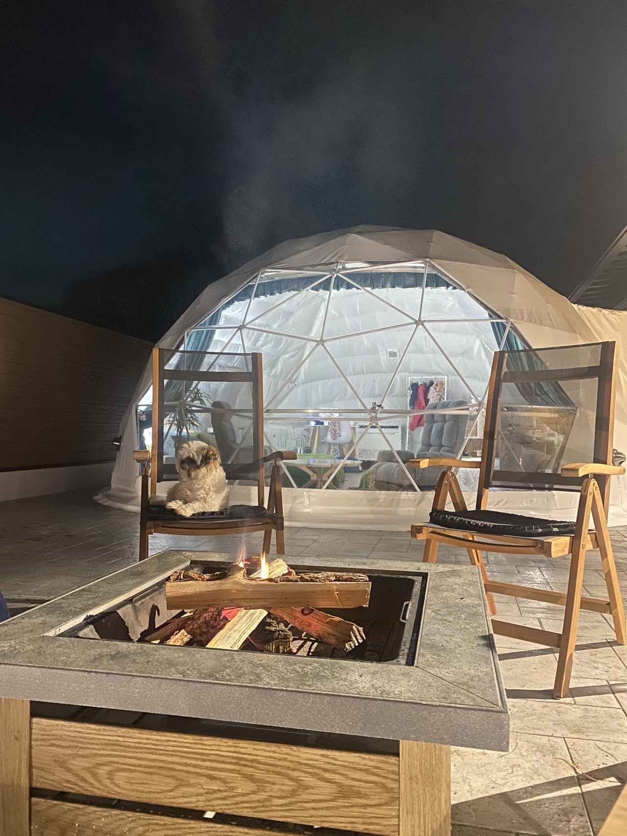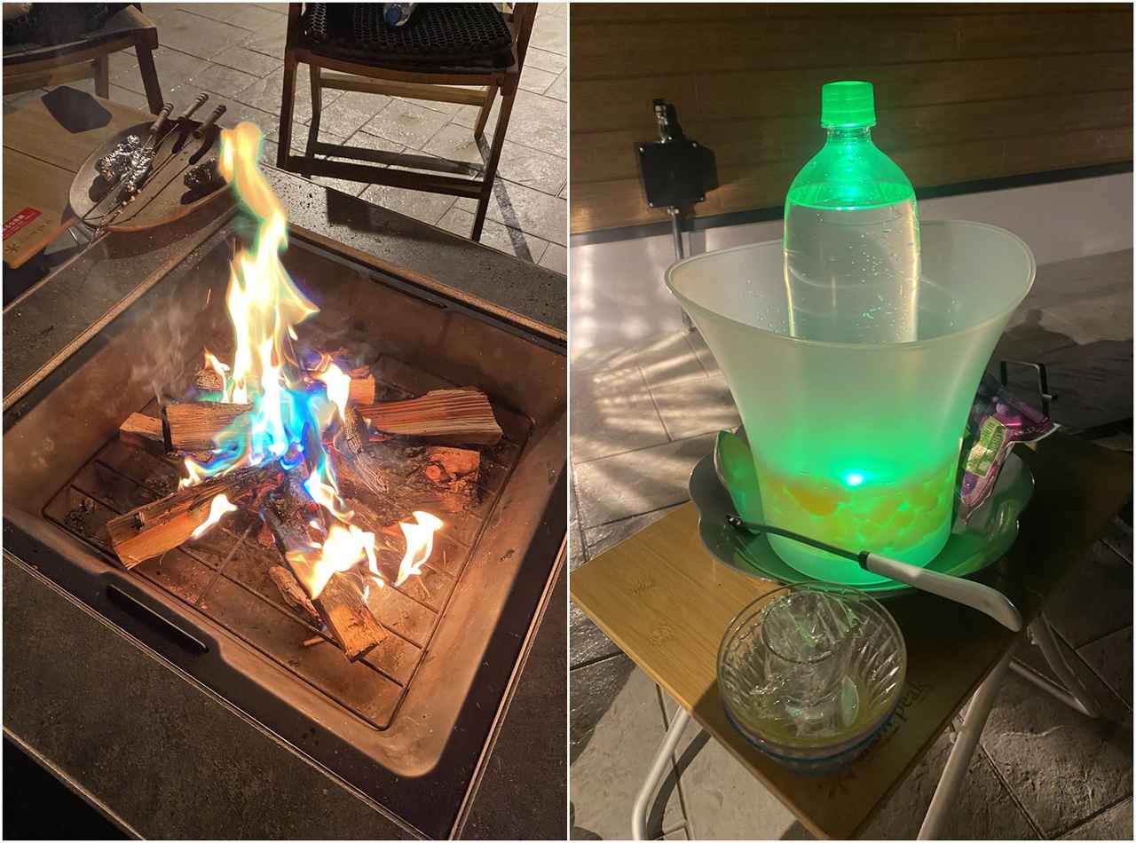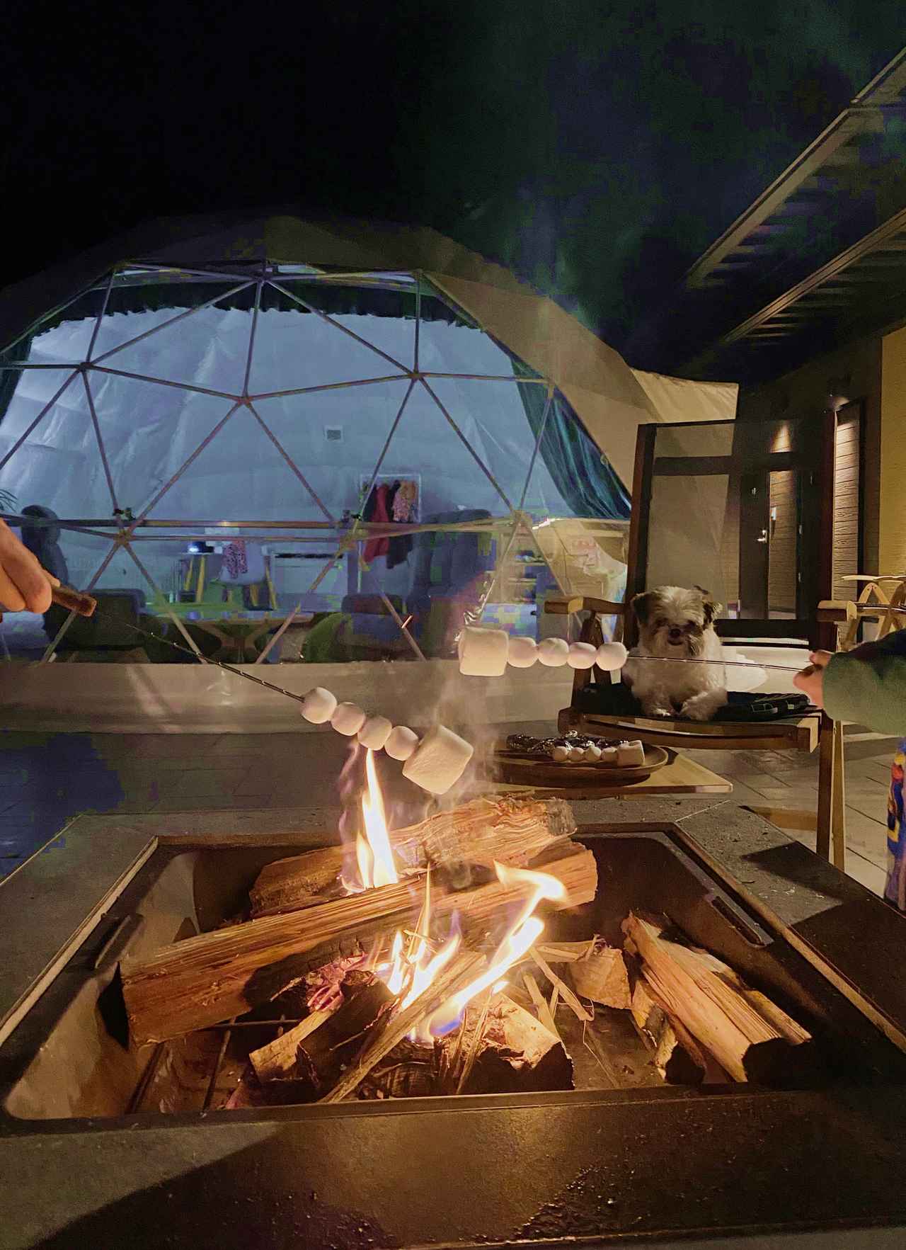 富士山を眺めたり、露天風呂やサウナに入ったりすること以外に、焚火を囲んで焼きマシュマロや焼き芋づくりができるほか、噴水フルーツポンチや虹色焚火といったお楽しみも用意されている(有料)。そして夜がふけてきたら、ドームテントの中に移動してゲームやおしゃべり。ドームテントは前面がクリアなため、温かいドームテントの中で外の焚火を眺めながらの団らんは最高だった(※寝る前は火の元だけは要確認)。