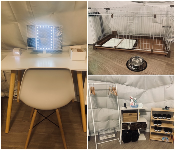 メイクミラーつきのデスク、ペットサークル、荷物やジャケットが置けるエリア。