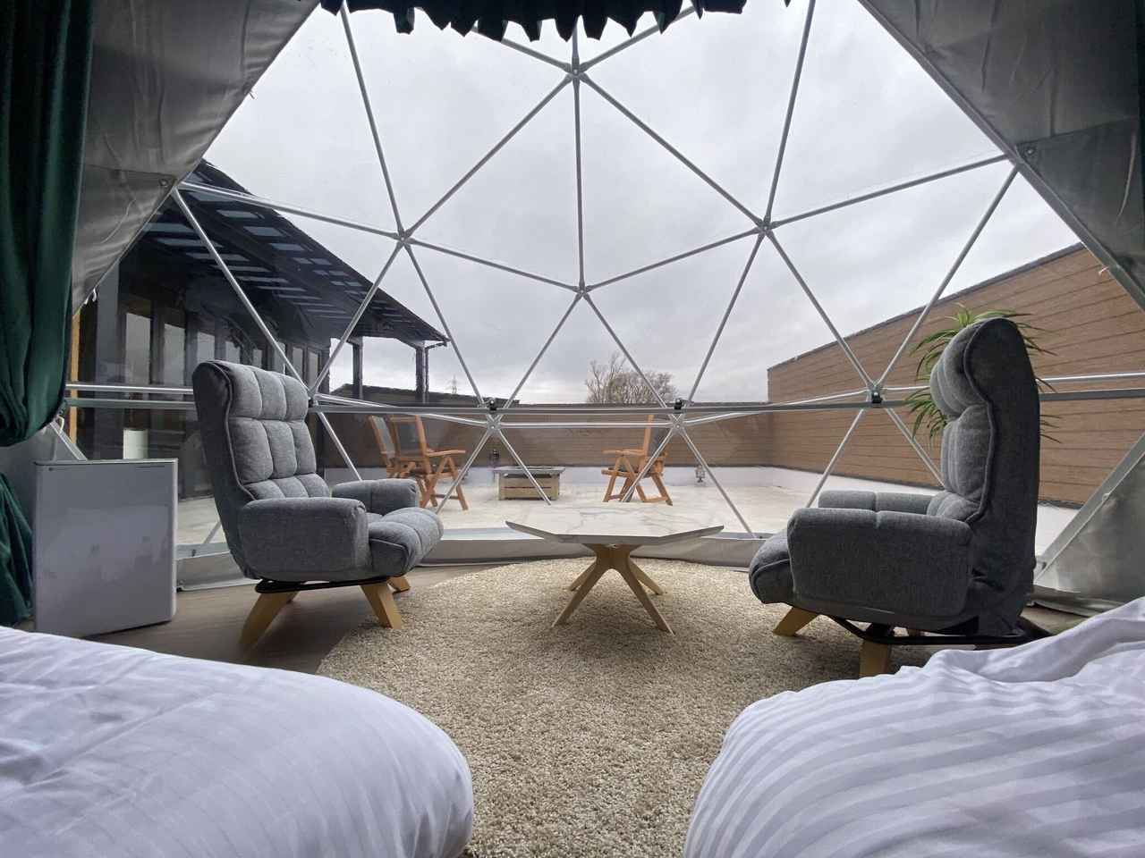 ドームの中からチェアやベッドでくつろぎながら火を見る、という楽しみ方もある。