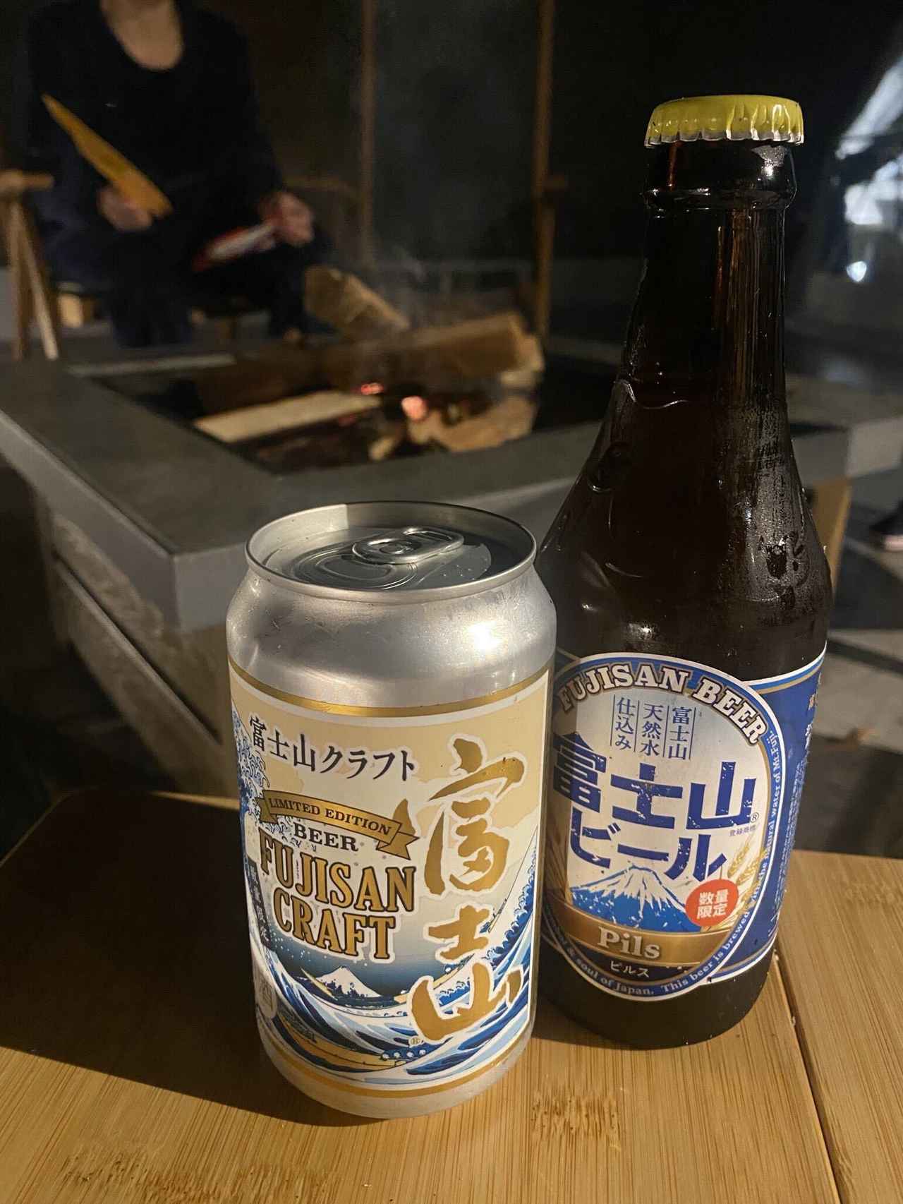 標高約1,000メートルの澄んだ空気のなか焚火を見ながら富士山ビール。
