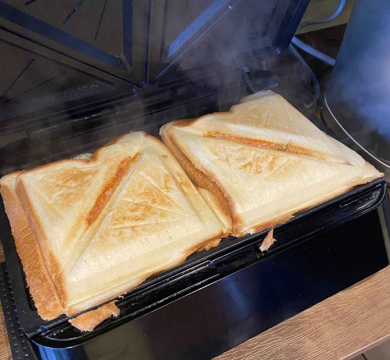 朝はホットサンドメーカーで、ハム、チーズ、ソーセージを使ったホットサンドづくり。そのほかにサラダと、フラッシュなヨーグルト・フルーツスムージもついてきた。