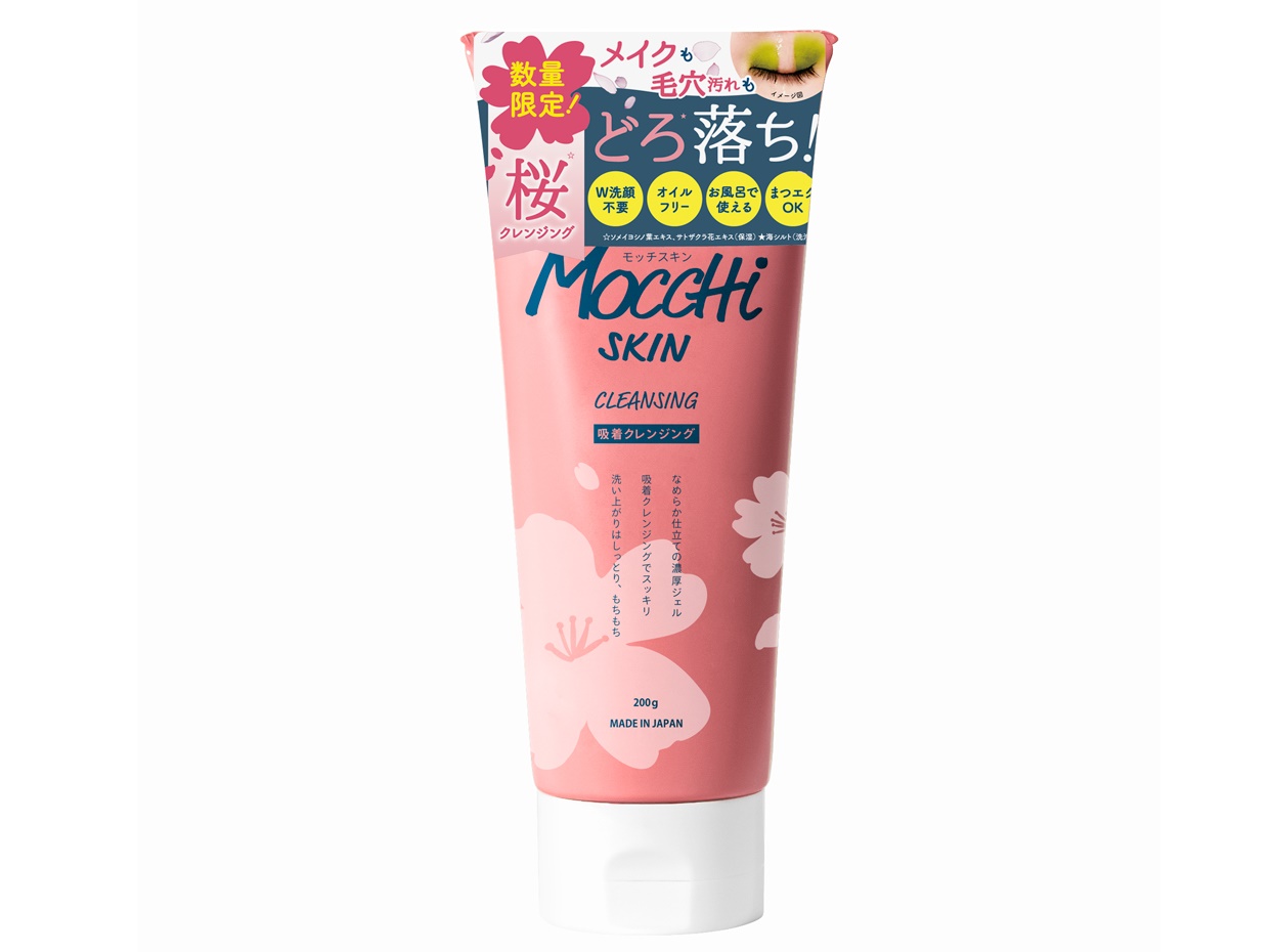 「モッチスキン 吸着クレンジングSK(桜)」は、讃岐和三盆で肌を柔らかくし汚れを取りやすい状態に整え、酵素・クレイ等の美容成分が毛穴の汚れを溶かして吸着。ウォータープルーフのメイクもしっかりオフ。ぷるんと弾力のあるジェルで肌に摩擦を与えることなく、負担の無いクレンジングが可能に。