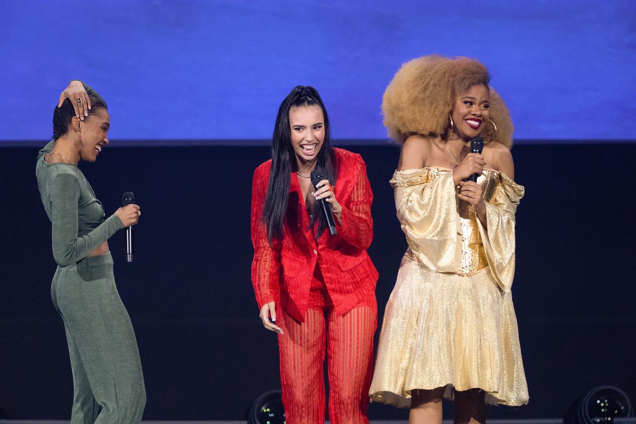 D23 Expo 2022のショーケースに登壇したウーマ役のチャイナ・アン・マクレーン(左)とレッド役のカイリー・キャントラル(中央)、レッド役のダラ・レネー(右)。