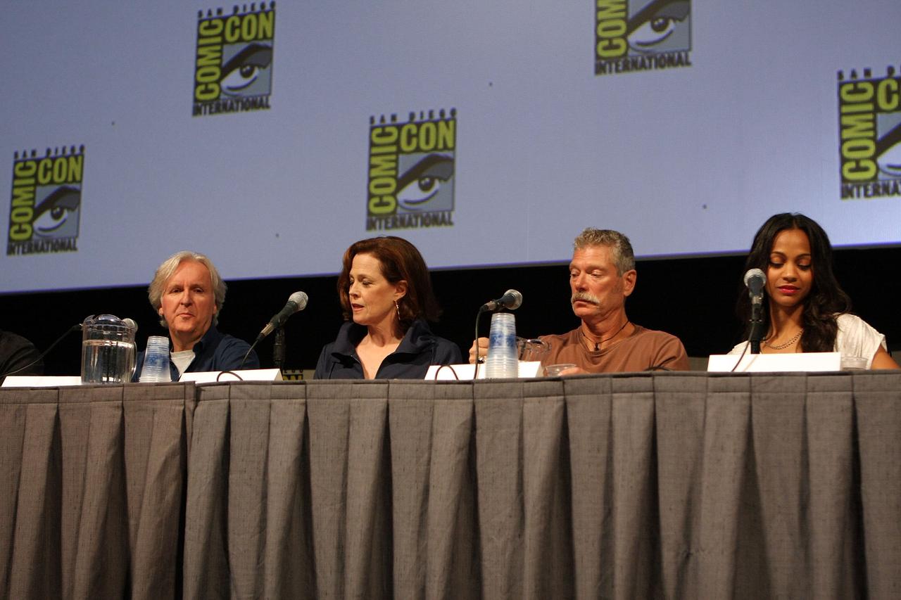 (左から右に)『アバター』をプロモーションするため、2009年7月に行なわれたサンディエゴ・コミコンに出席したジェームズ・キャメロン監督、シガニー・ウィーバー、スティーヴン・ラング、ゾーイ・サルダナ。