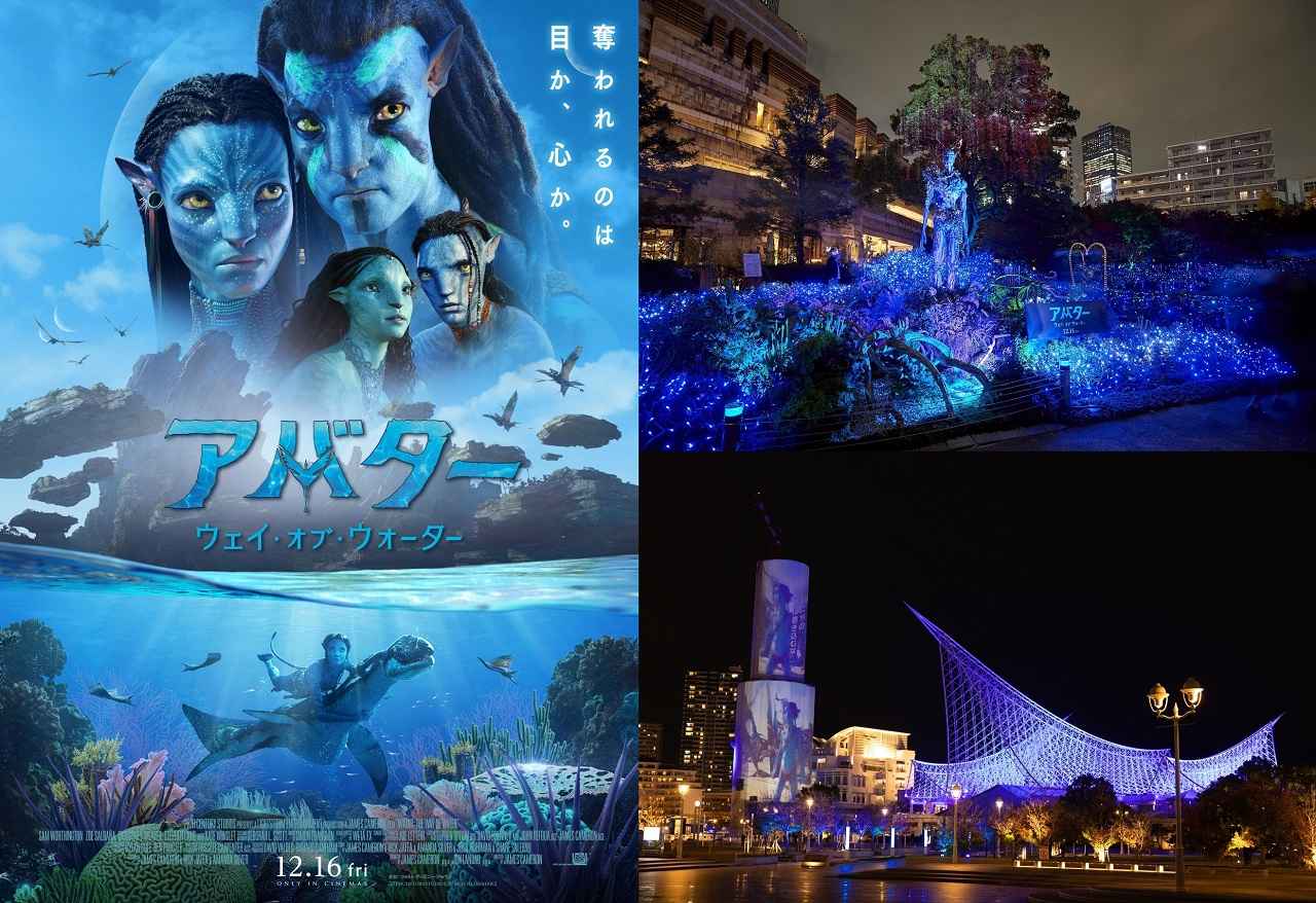 一方、神戸のランドマークである神戸ポートタワーでは、『アバター:ウェイ・オブ・ウォーター』の映像を映し出すプロジェクション・マッピングが12月1日からスタート。プロジェクション・マッピングと同時に神戸メリケンパークの照明と噴水、特徴的な白い大屋根で有名な神戸海洋博物館も、美しい海をイメージした<アバター・ブルー>で幻想的にライトアップされ、さらに、物語の鍵を握る14歳の少女キリのフラッグも各所に掲げられている。