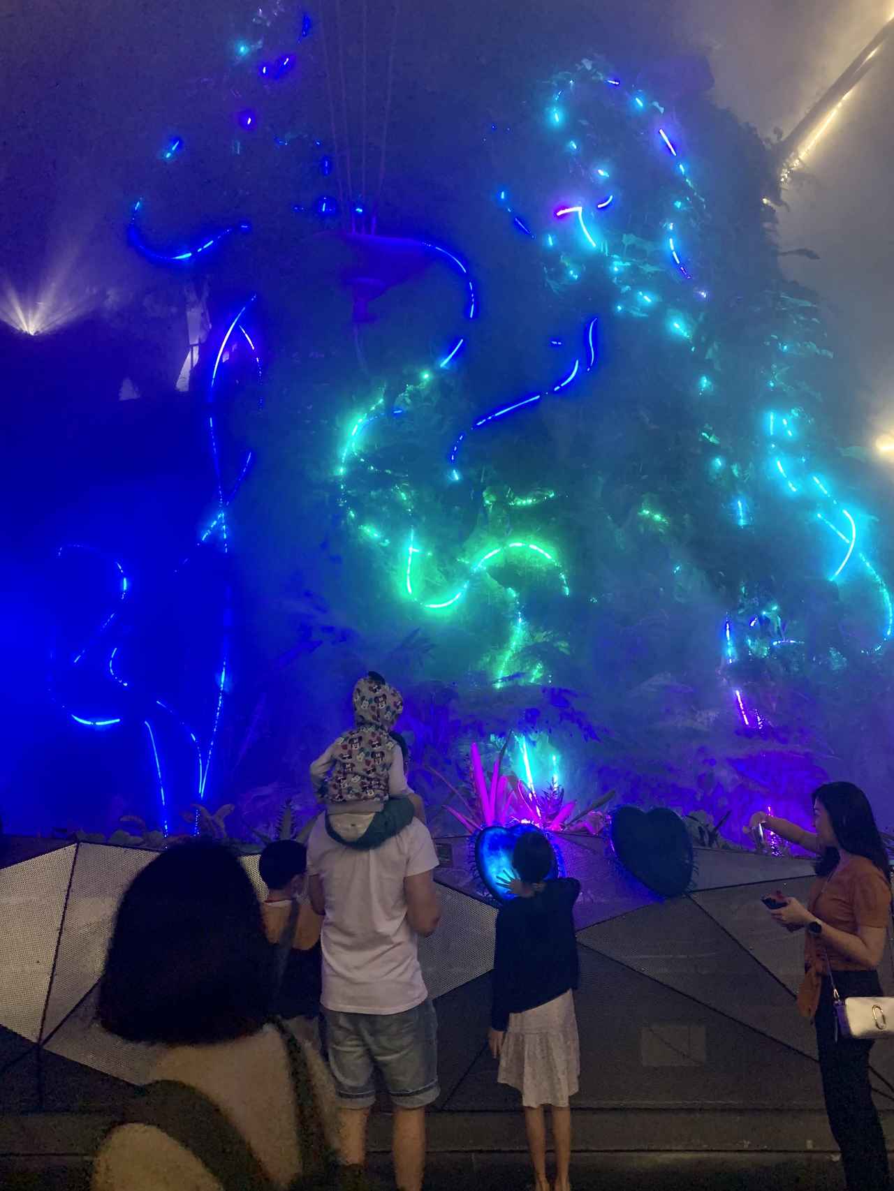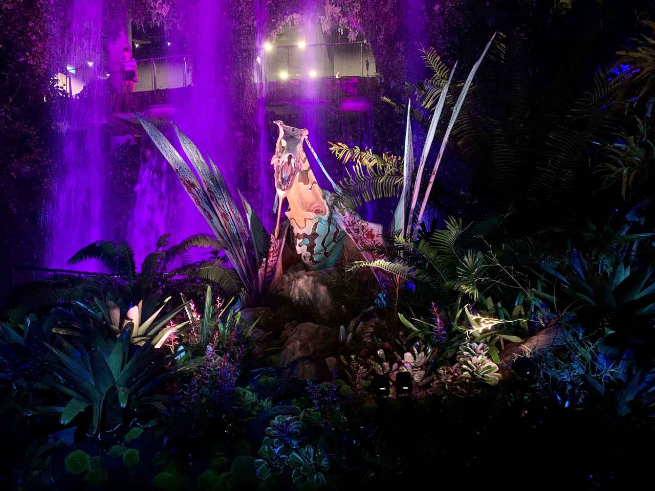 「アバター:ザ・エクスペリエンス」に足を踏み入れるとすぐに、最初のエリア“Cloud Forest”にてパンドラに生息するイクランことバンシーがお出迎え。背景に見えるのは、ガーデンズ・バイ・ザ・ベイを象徴する、約30メートルの高さがある滝。