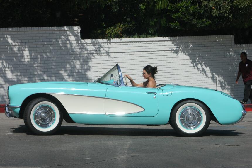 ケンダルが購入したのは、アメリカンスポーツカーの原点ともいえるシボレー「コルベット」の初期タイプで、美しいターコイズとホワイトのコントラストがスタイリッシュなオープンカー。ロサンゼルス市内を颯爽と運転するケンダルが絵になると有名だ。