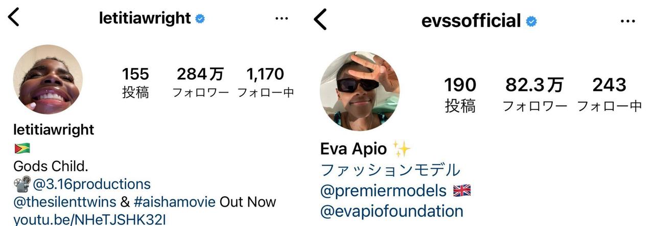 レティーシャ・ライトとエヴァ・アピオのインスタグラムのプロフィール