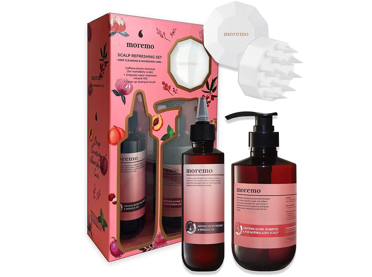 韓国発のヘアケアブランドmoremo(モレモ)の「スカルプリフレッシングセット」は、ブランドの看板アイテムであるウォータートリートメント、カフェインバイオームシャンプー、シャンプーブラシがセットになった製品。ダメージヘアから頭皮までトータルでケアできる。