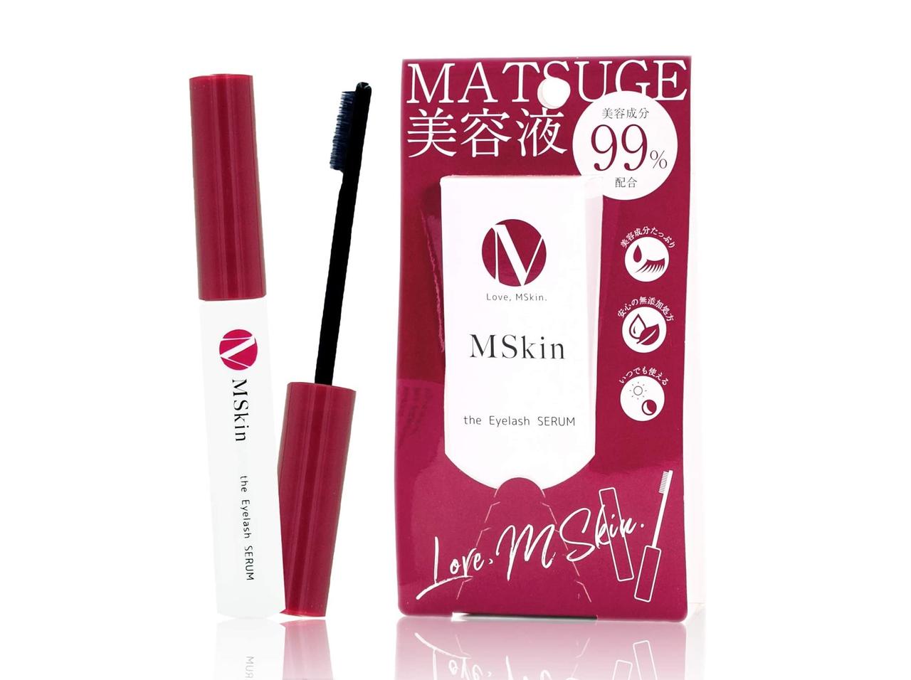 MSkin(エムスキン)の「ザ まつげ美容液」は、まつげケア成分17種類を高濃度配合し、なんと美容成分99%でできている美容液。マスカラブラシで、まつげ1本1本に丁寧に塗布できるのも嬉しい。