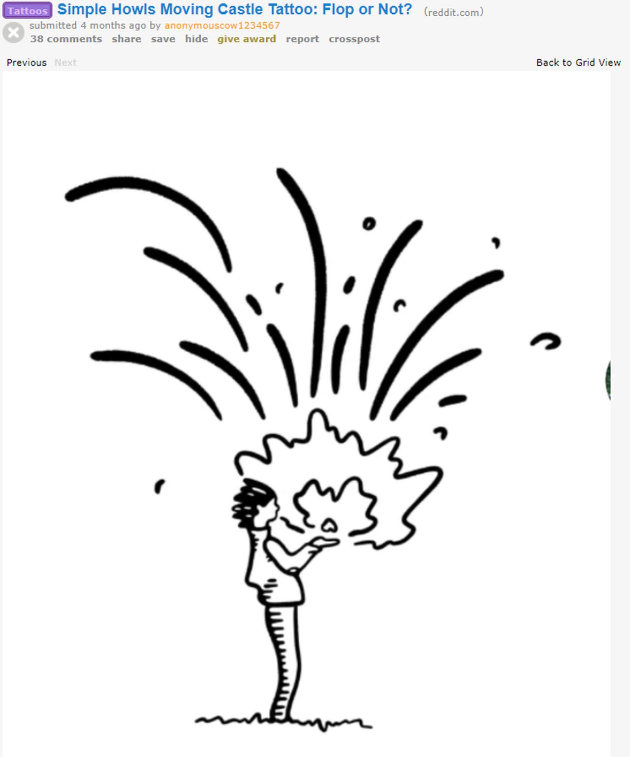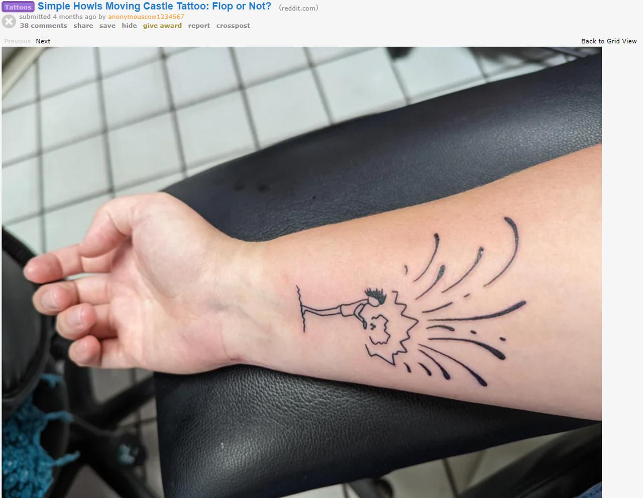 しかし、そのイラストをタトゥーアーティストに見せたものの、出来上がった作品が微妙なクオリティとなってしまい、米掲示板サイトRedditでこんな投稿を。「タトゥーを気に入っているけど、それが(『ハウルの動く城』をモチーフにしたものだと)分かるのかとか、変じゃないかとかに確信が持てない。顔の丸い輪郭が少し気になる。だんだん好きになるかなと思うようにはしてるけど、悪いタトゥーを入れちゃったかな。あと、タトゥーアーティストが映画自体を知らなかったことも助けにならなかった」。