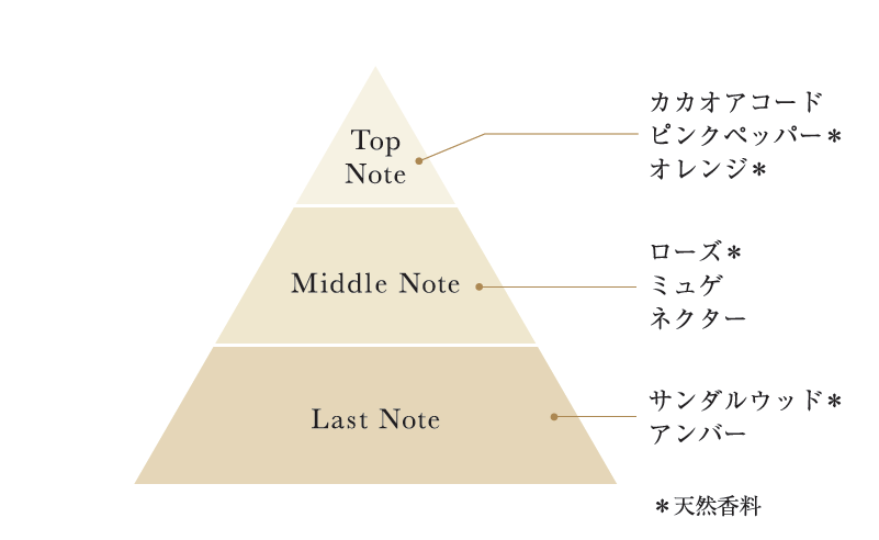 カカオのようなほろ苦さとピンクペッパーのスパイス、シトラスの爽やかさが織りまざり、そこにローズやミュゲ、みずみずしい花の蜜が重なって、そよ風にのったチョコレートコスモスの香りを連想。そしてラストノートにはサンダルウッドやアンバーが香り立ち、しっとりとした落ち着きと大人の色香をもたらしてゆく。