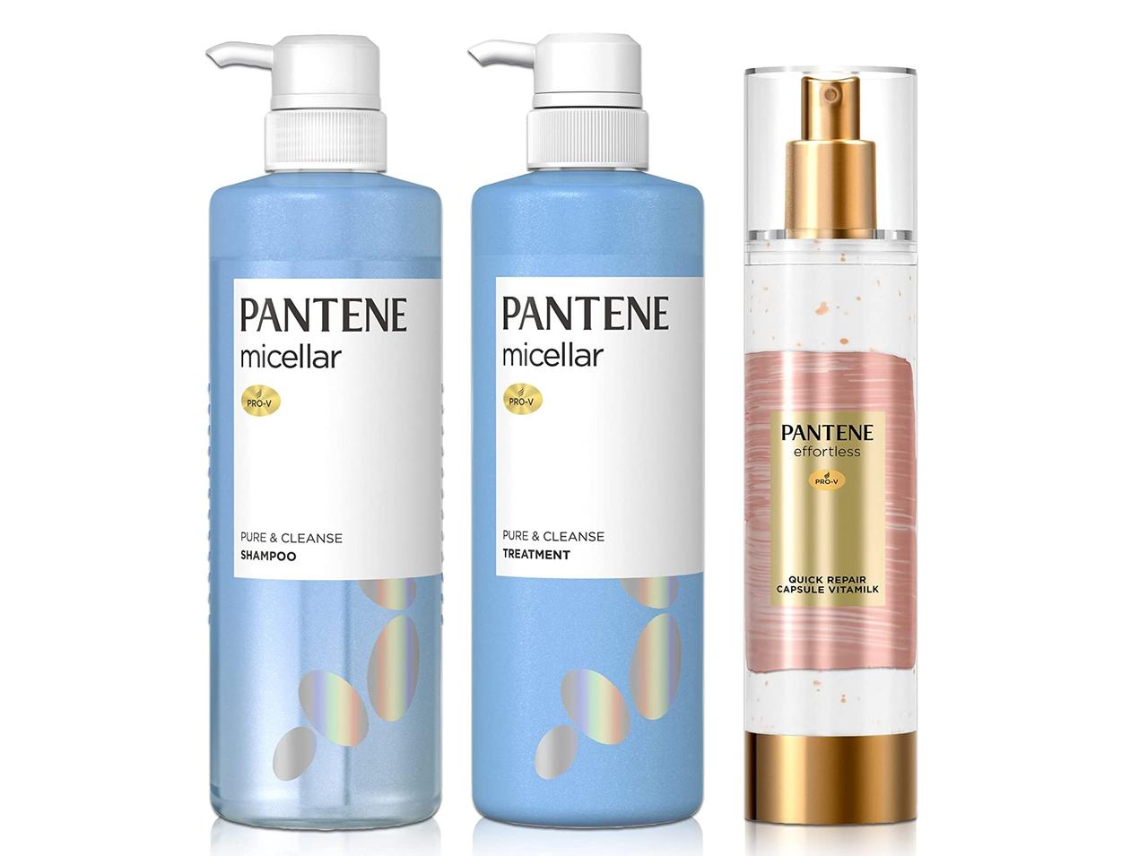 パンテーンのミセラーシリーズのシャンプー、トリートメント、そしてヴィタミルクの3点セット。ピュア&クレンズのシャンプーとトリートメントは、地肌も髪もすっきりサラサラを目指したい人にぴったり。