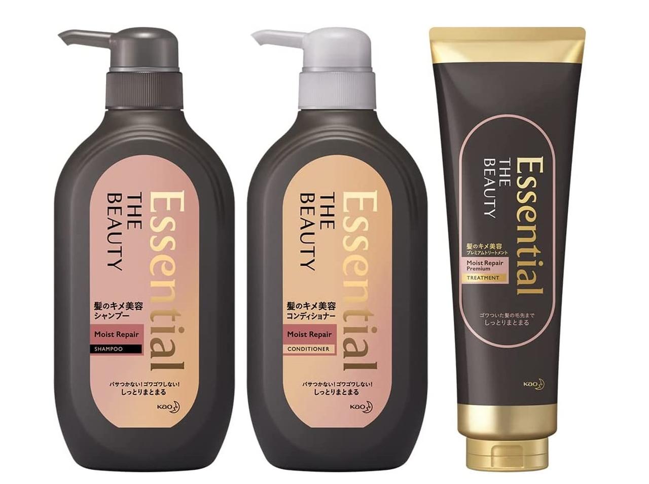 エッセンシャル ザビューティの「髪のキメ美容シャンプー モイストリペア」「髪のキメ美容コンディショナー モイストリペア」「髪のキメ美容 プレミアムトリートメント モイストリペアプレミアム」の3点セット。しっかりまとまる、キメの整った髪に近づく。