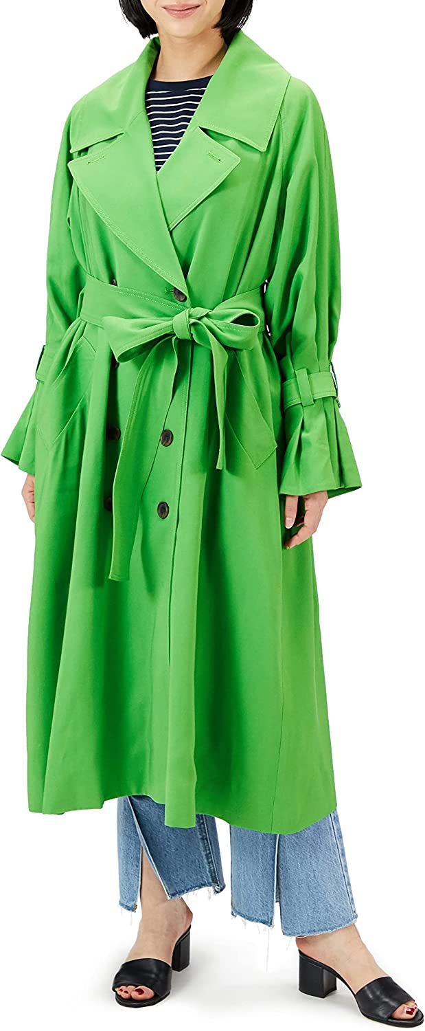 鮮やかなグリーンが目を引く、トレンド感のあるビッグカラーがポイントになったトレンチコート。顔回りがすっきり見えるように襟を少し抜き、天幅から前下がりまでを計算して美しいラインを演出。袖口はタックを寄せ、そこから広がるフレアなフォルムでエレガントさが高まる。
