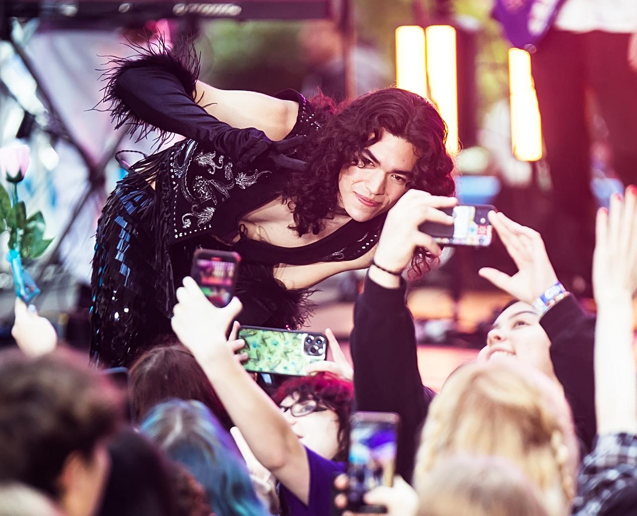 パフォーマンス時にスマホを掲げるファンに自分から寄って行ってポーズするコナン・グレイ。