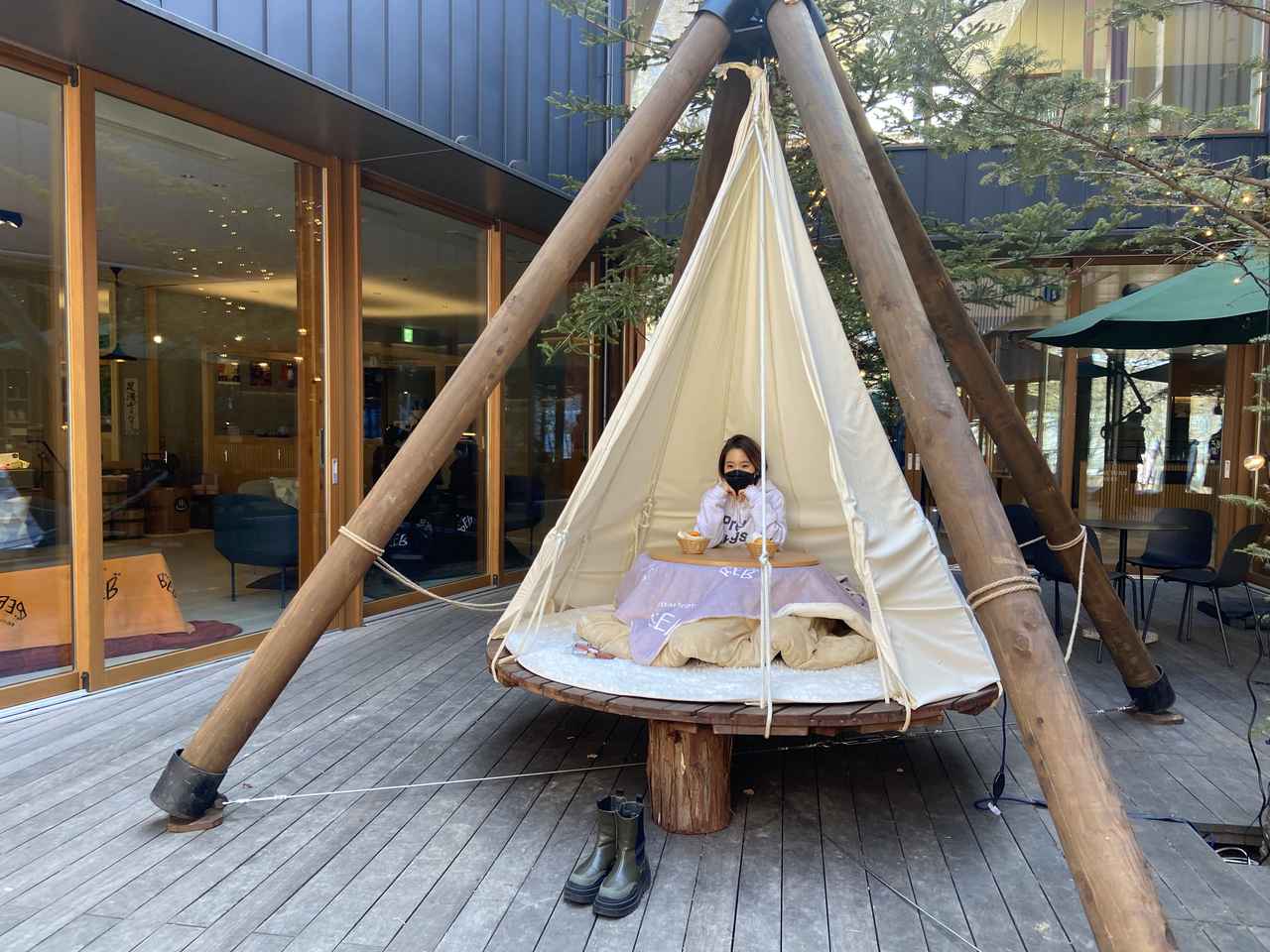 まず紹介したいのは、BEB5軽井沢のパブリックスペース「TAMARIBA(タマリバ)」の中庭に設置してある「ゆらゆら空中こたつ」。その名の通り、宙に浮かぶユニークなこたつで、冬の軽井沢の凛とした空気と静けさのなか、ハンモックのようにゆらゆらと揺れながらこたつで温まることができる。