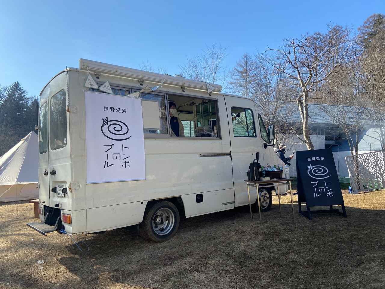 プールやサウナの合間には、ノンアルコールのホットワインや丸山珈琲のカフェラテなどを販売するキッチンカーで好きな飲み物を買ってひと休み。きれいな景色を眺めながら焚火を囲めば、仲間との会話も弾んじゃいそう。