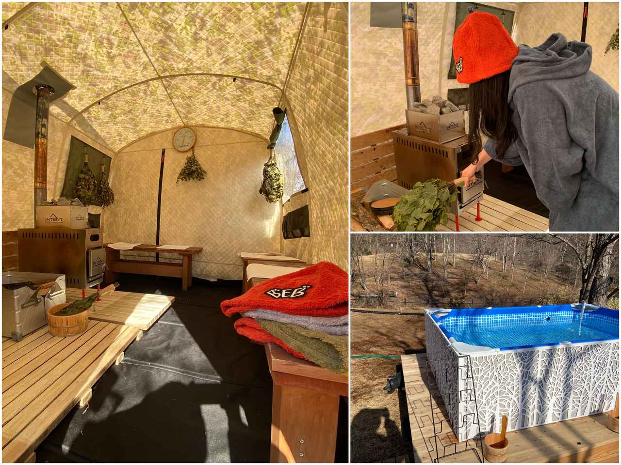 トンボのプールの近くには、真冬の大自然を楽しみながら整える「テントサウナ」も登場。テントサウナとは、テント内で薪ストーブを焚いてサウナができるアイテムで、ストーブ上で熱したサウナストーンに水をかけ、蒸気を発生させて楽しむ「ロウリュ」方式が楽しめる。