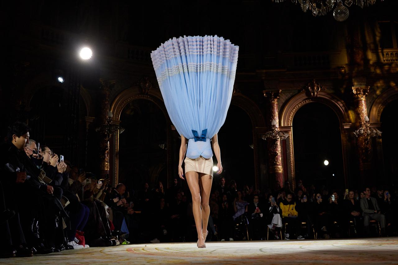 ヴィクター&ロルフのお得意のチュールをたっぷり使ったボリューミーなドレスが続々と登場するなか、上下逆さまになったドレスや横むきや斜めになったドレスなど型破りなドレスを着用するモデルが登場すると、その様子は一気にSNSで話題に。