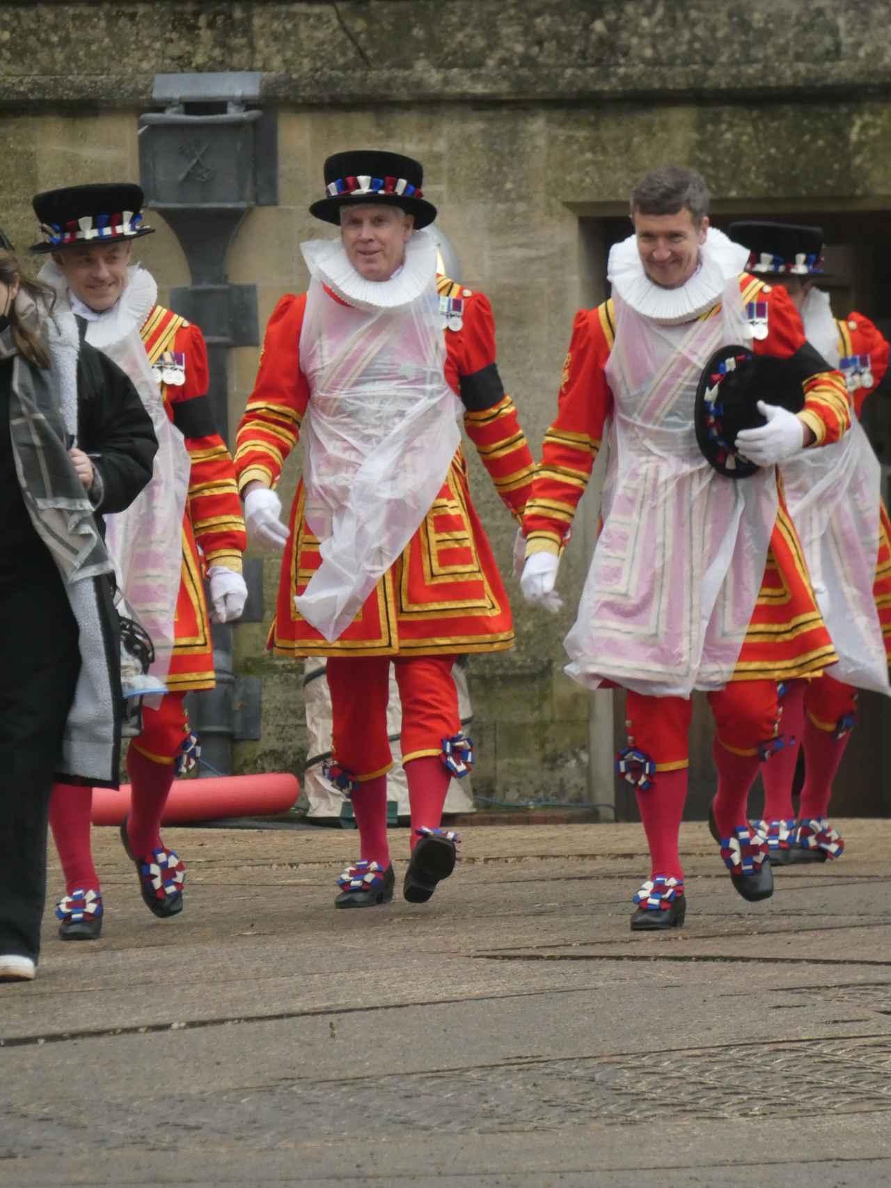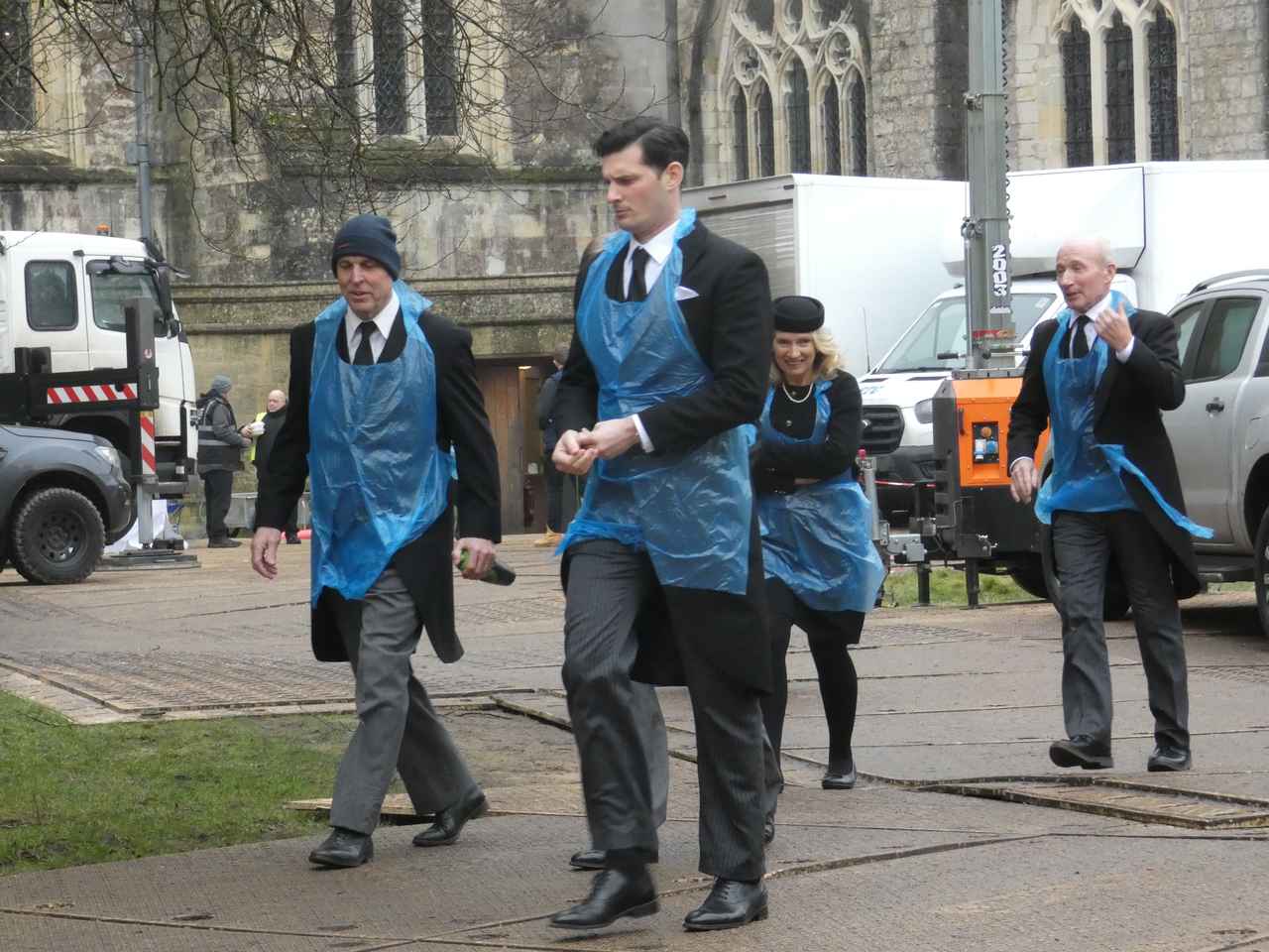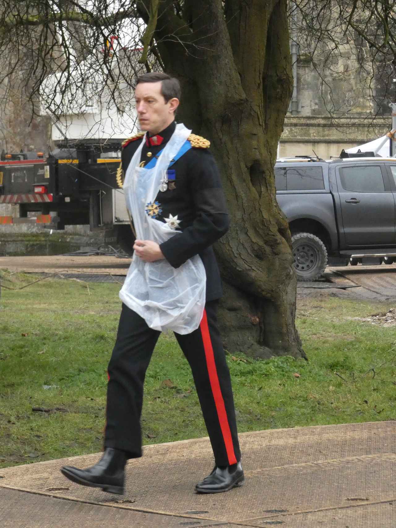 ダイアナ妃の葬儀が行なわれたのは1997年9月6日のことだったが、今は真冬の1月。衣装だけでは寒かったようで、キャストやエキストラはコートを着たり、ブランケットに包まったりしていた。また、衣装が汚れるのを防ぐためだろうか、ビニールの前掛けのようなものを身に着けている人も。