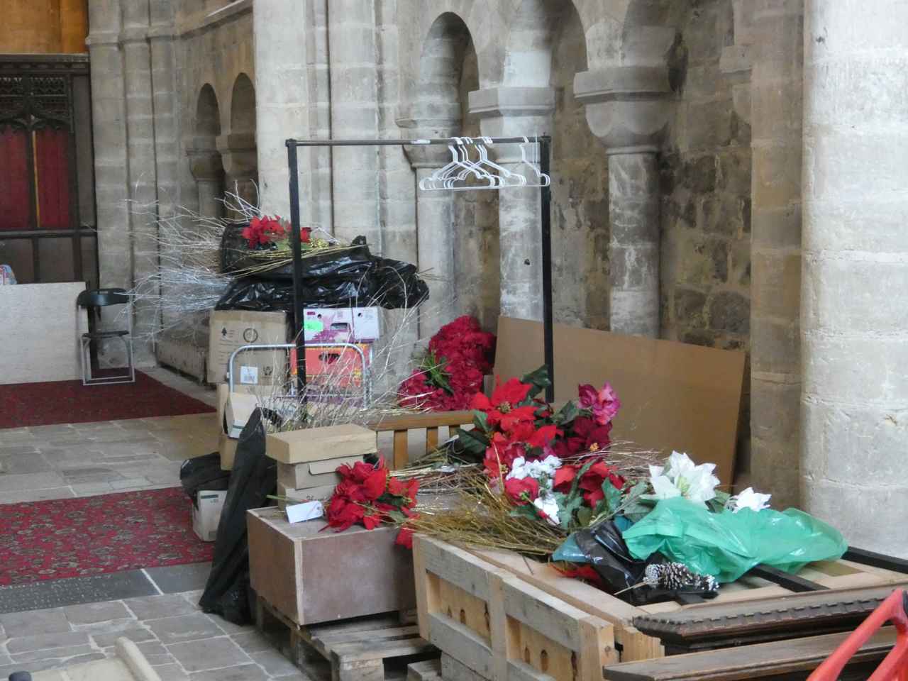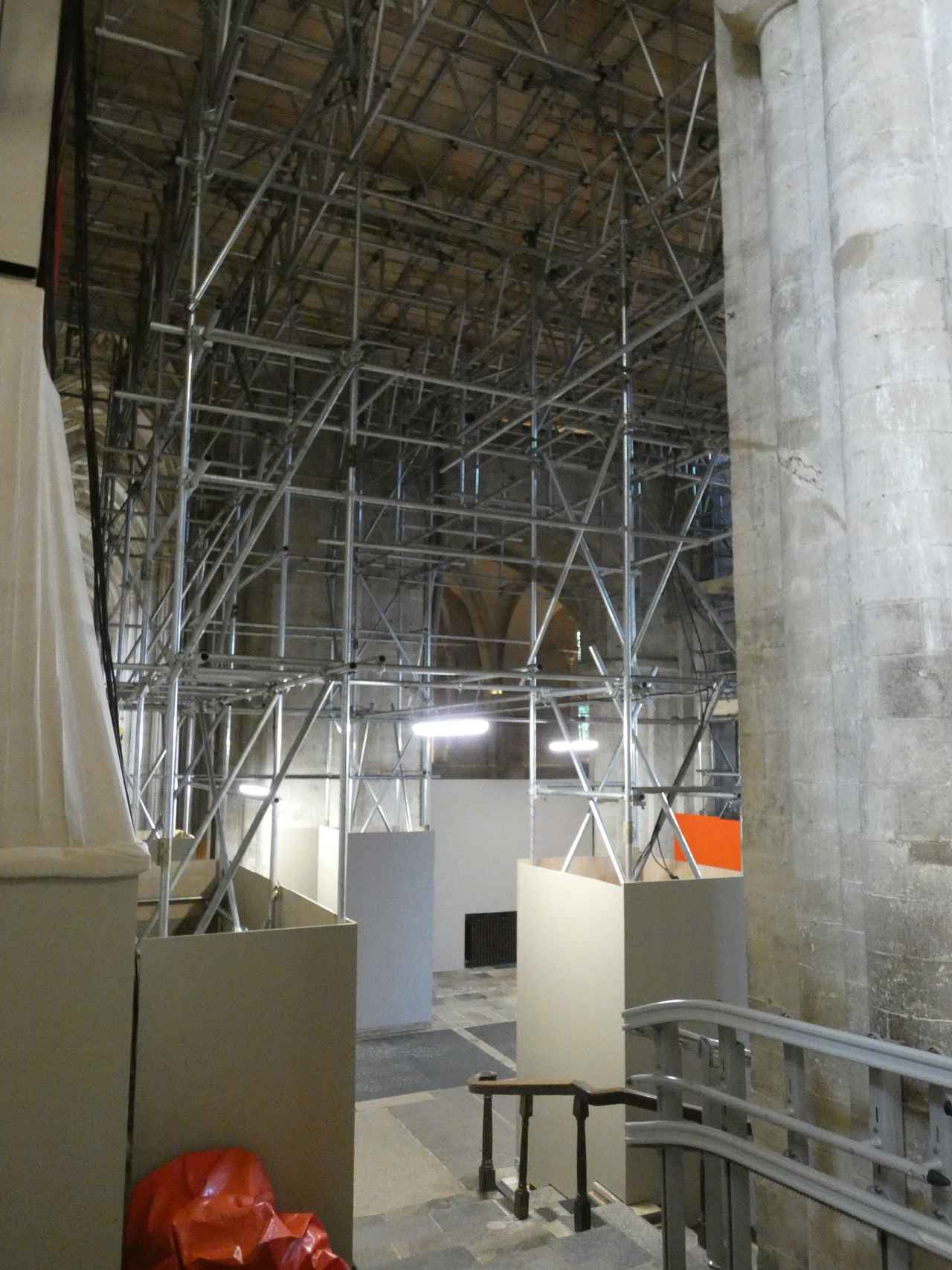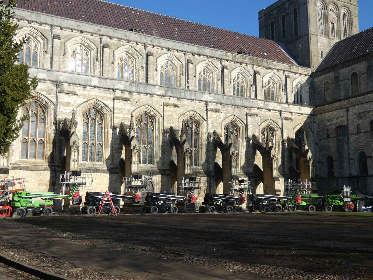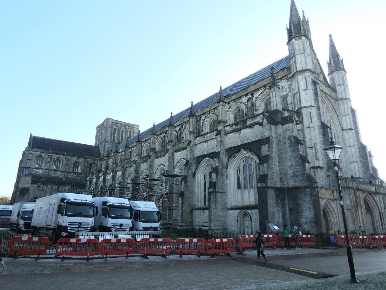 大聖堂では撮影のために荷物が運び込まれ、大型トラックも大量に停まっていた。