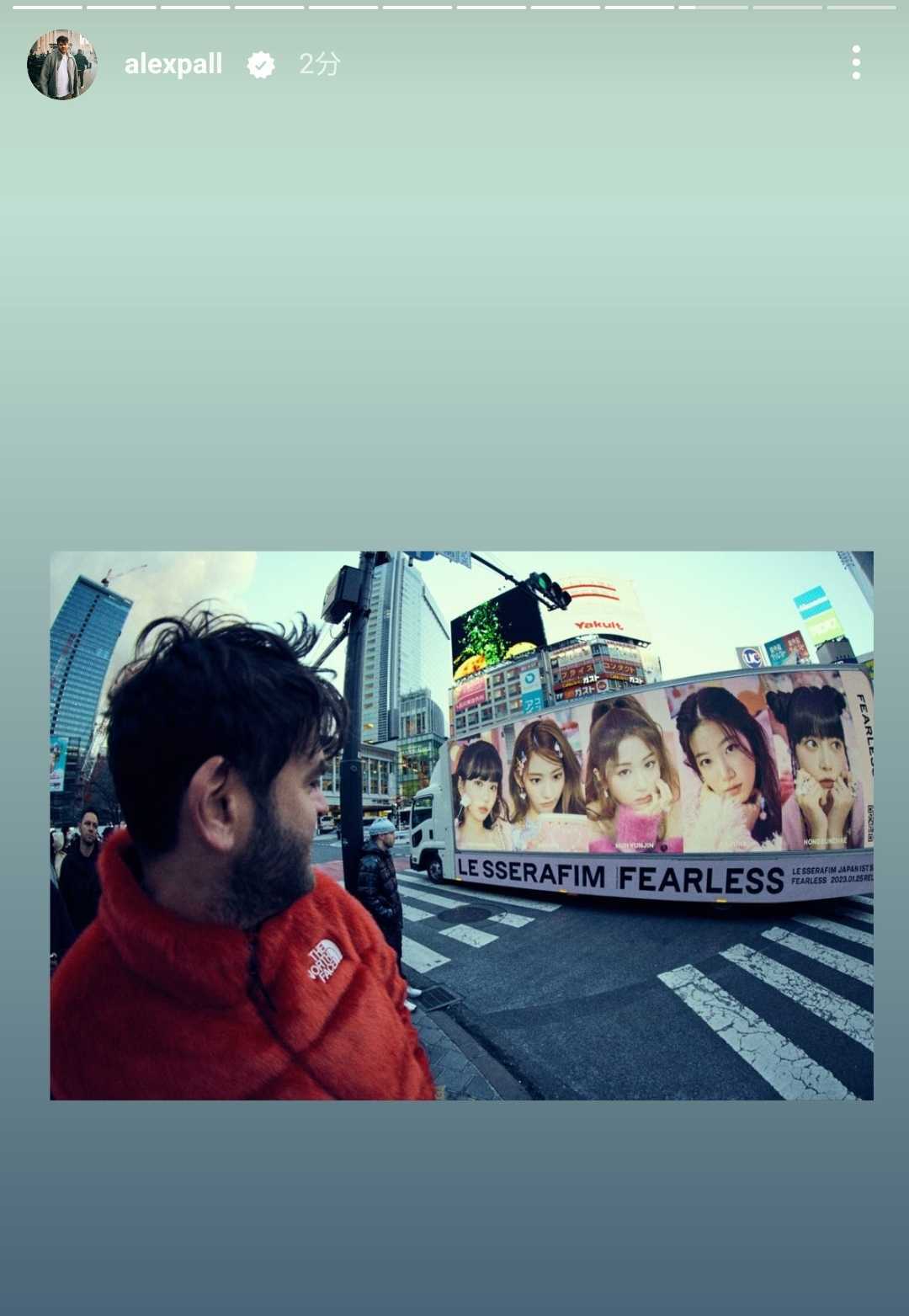 アレックスはLE SSERAFIMのメンバーを街中で発見したとはいえ、実際に本人たちがいたのではなく、見つけたのは1月25日にリリースされた日本ファーストシングル「FEARLESS」を宣伝するトラック。アレックスは渋谷でそのトラックを見つけると気になったのかガン見。