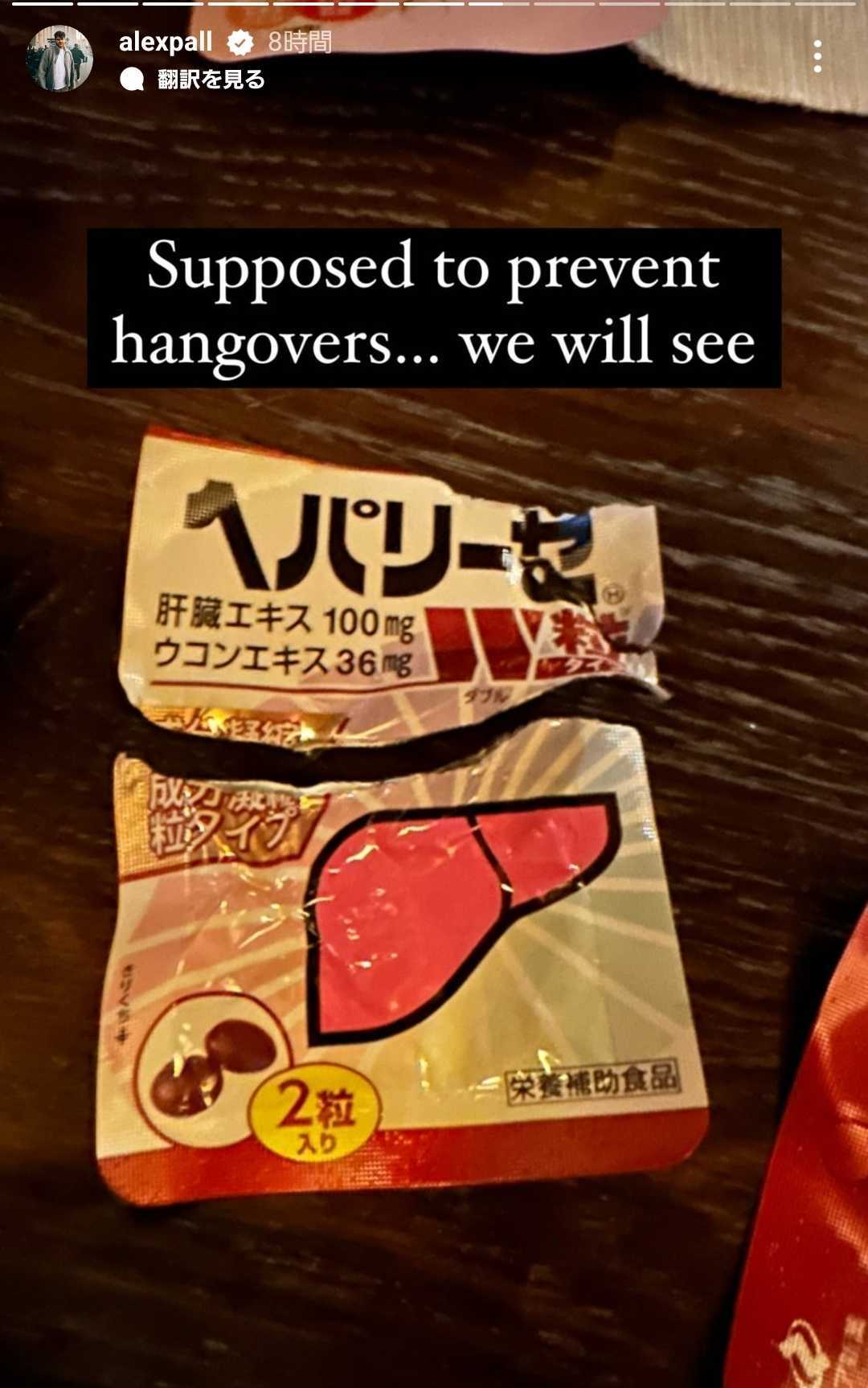 お酒を飲む前にヘパリーゼを飲む人も多いため、アレックスもパーティー前にヘパリーゼを摂取。「二日酔い防止になるそうです。試してみましょう」とキャプションを添え、その効果に期待していた。