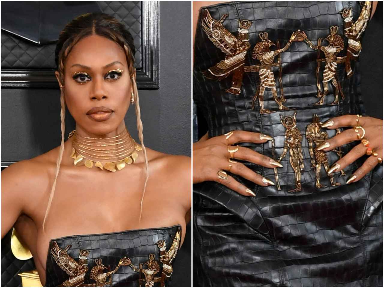 俳優のラバーン・コックスは、古代エジプトの神々が胸元にあしらわれた黒のロングドレスでお目見え。ゴールドのアイシャドウやネックレスに合わせたゴールドのロングネイルが、まるで本物のアクセサリーのようで素敵。